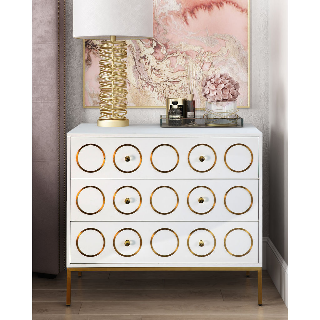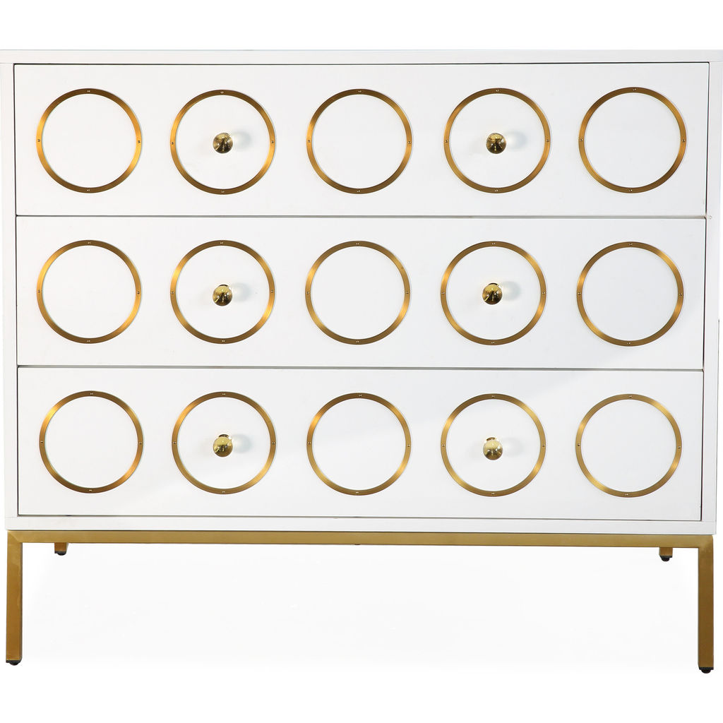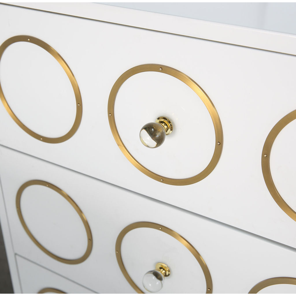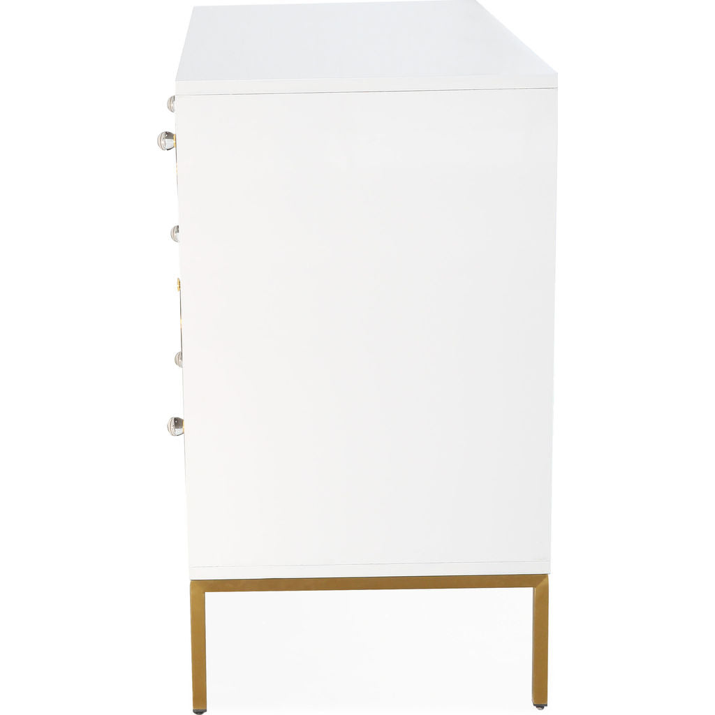 The TOV Furniture Ella Chest in White/Gold is a mix of Mid-Century modern design and Hollywood glam. This dresser was born to make a statement. Everyone is sure to love the brushed gold accents and the lucite hardware against the lacquered white finish. Use this piece in your living room or bedroom to add an element of glamour.
