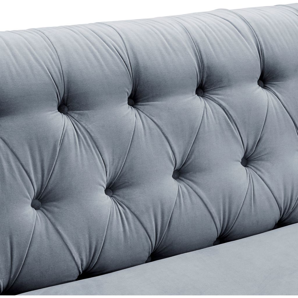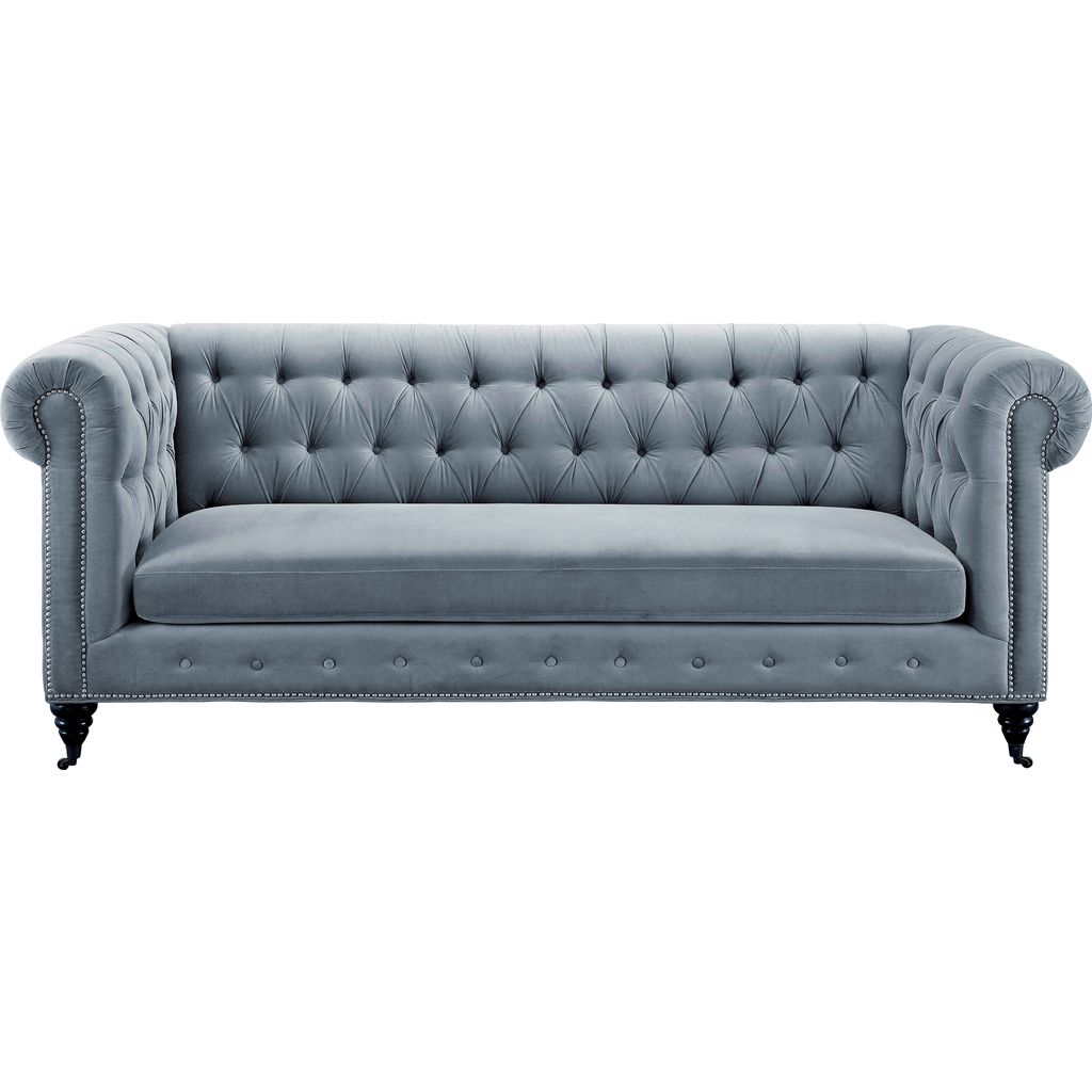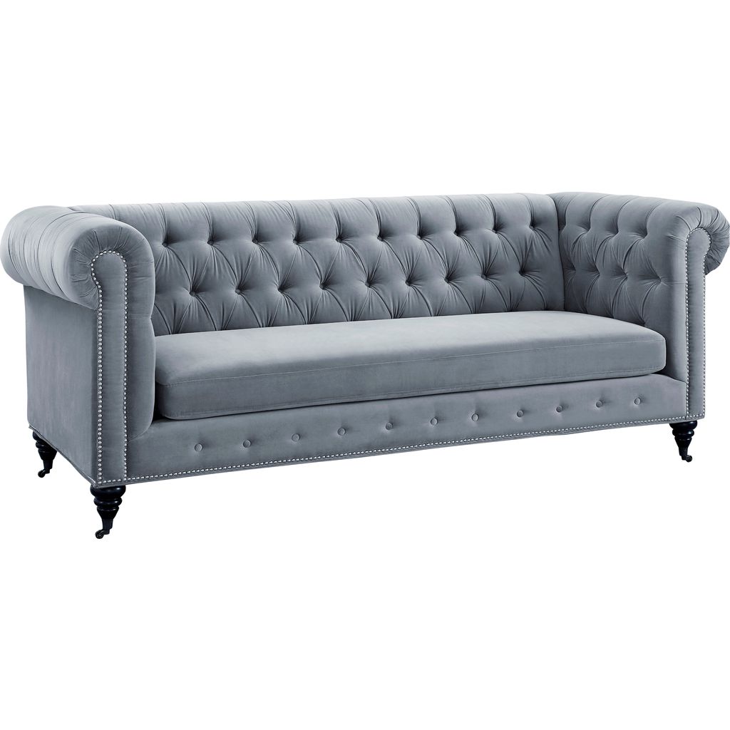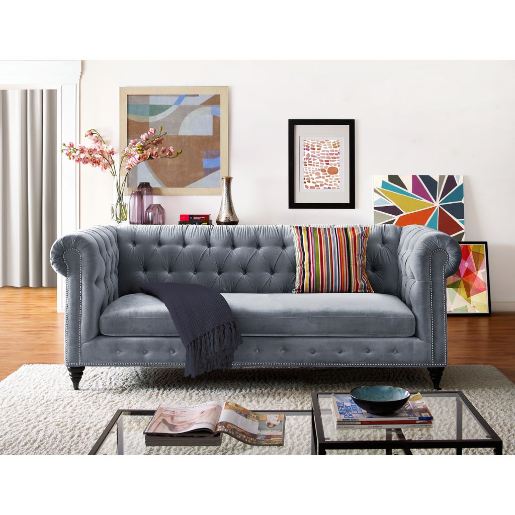 Inspired by the 18th-century forebearer TOV Furniture designed the Hanny Grey Velvet Sofa. Featuring beautiful nailhead trim and classic rolled English arms. An oversized shape and plush grey velvet are a timeless style that will last for years to come. Crafted with a solid wood frame with bun shaped legs, this sofa is really comfortable and will be the center of attention in our space.