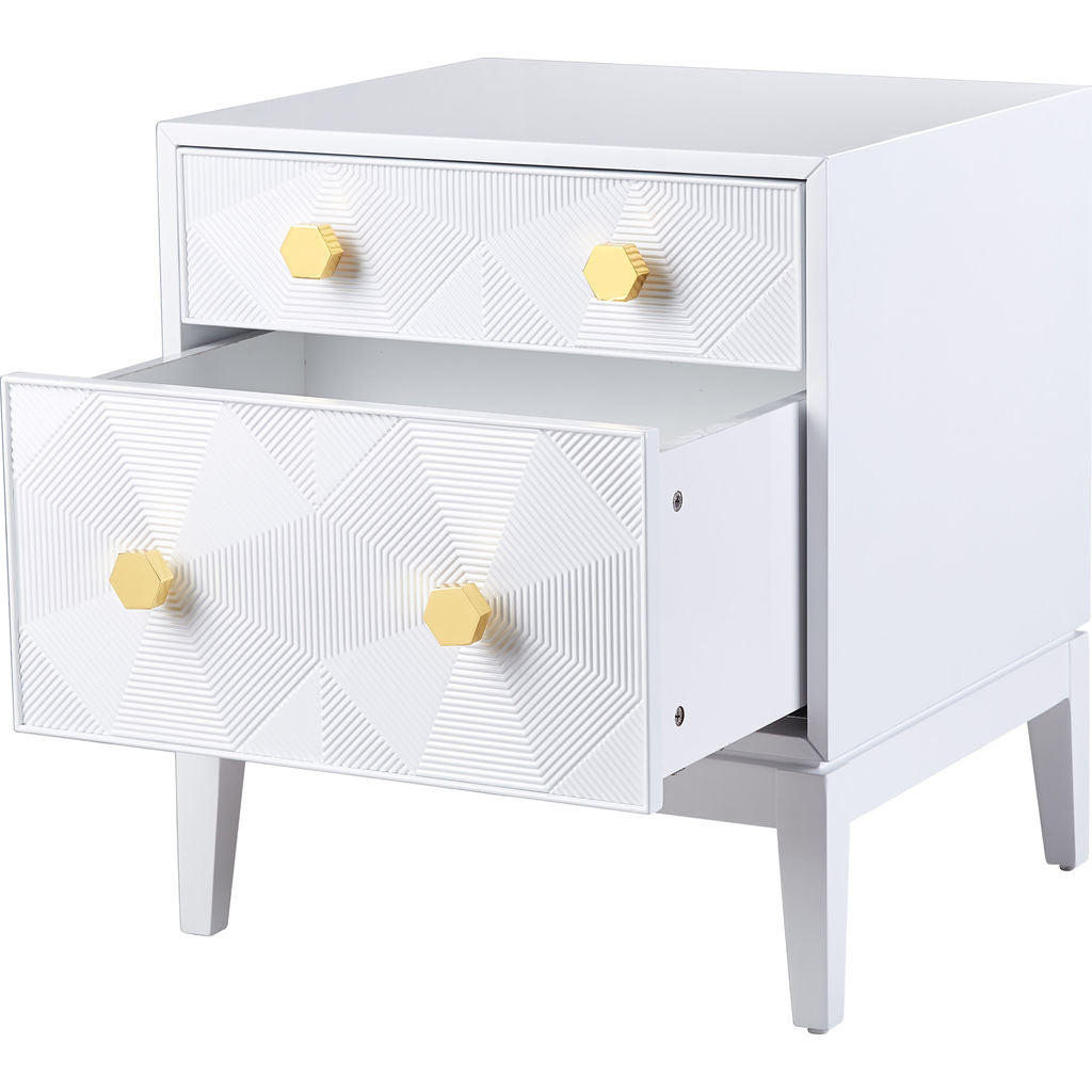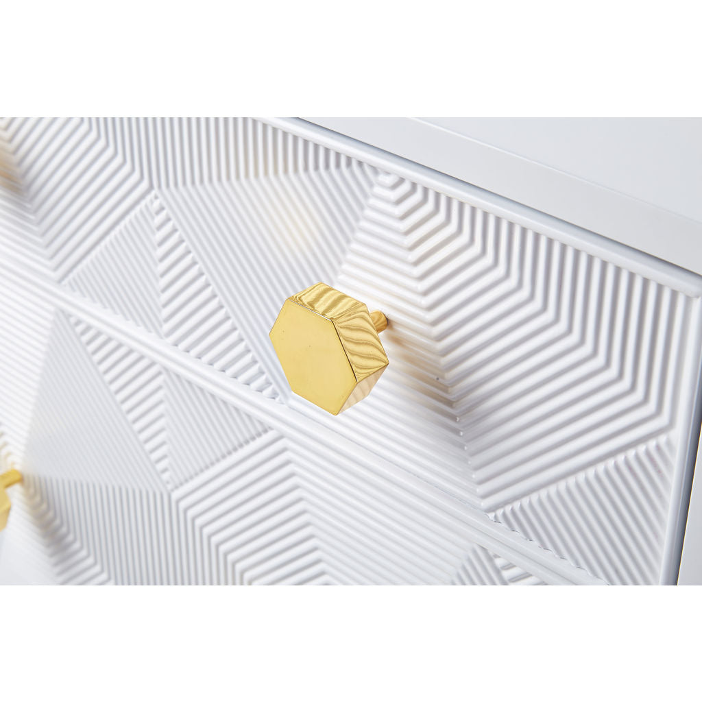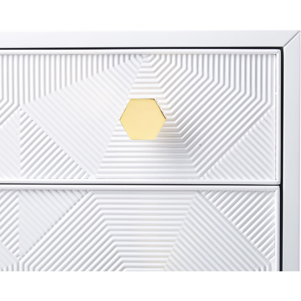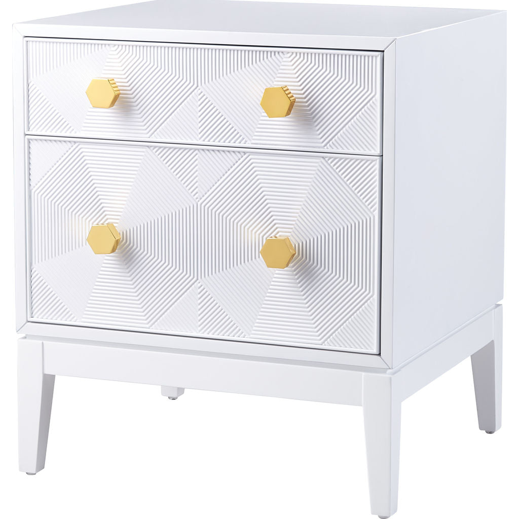 The elegant and intriguing Mila Lacquer Side Table in Matte White is the perfect addition to any room. Instantly add a stylish element with this TOV Furniture piece. Featuring unique glossy gold hexagon shaped handles. This sophisticated side table will go with many different styles, use in your bedroom or living room.