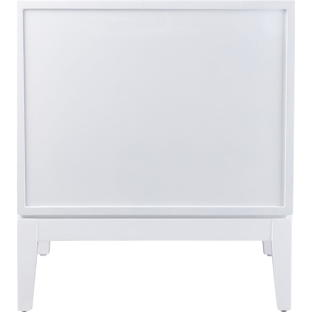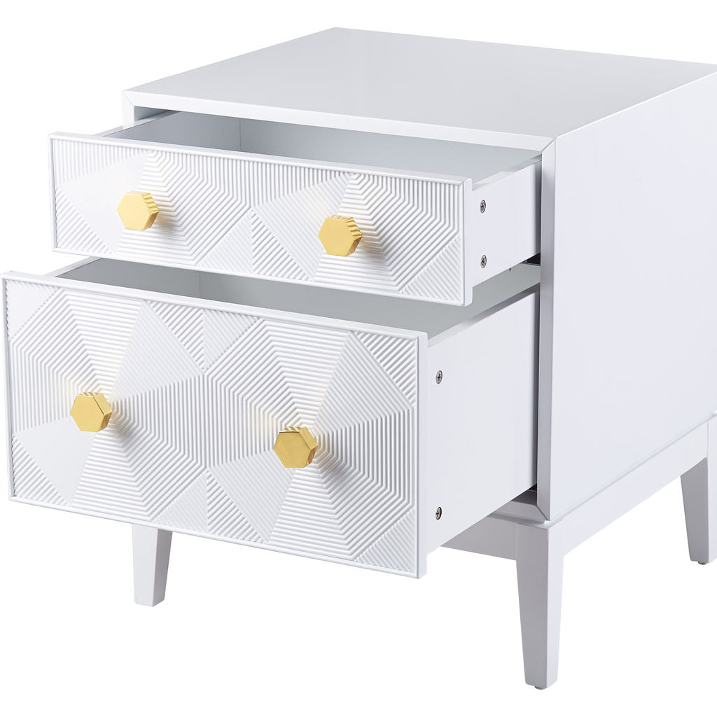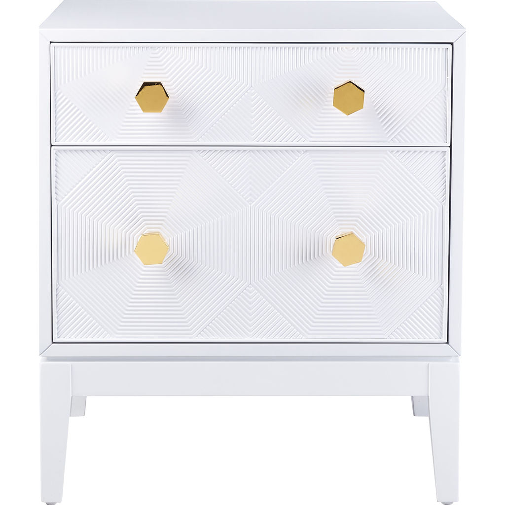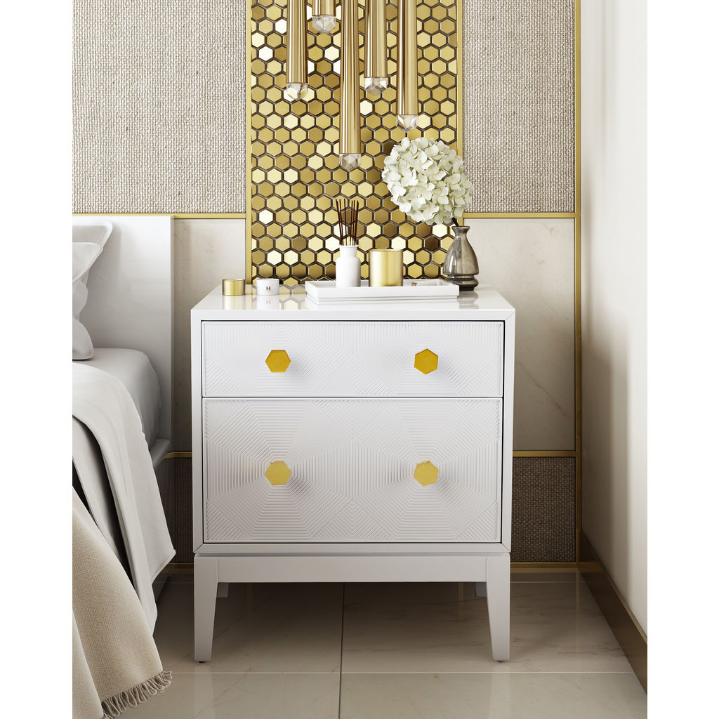 The elegant and intriguing Mila Lacquer Side Table in Matte White is the perfect addition to any room. Instantly add a stylish element with this TOV Furniture piece. Featuring unique glossy gold hexagon shaped handles. This sophisticated side table will go with many different styles, use in your bedroom or living room.