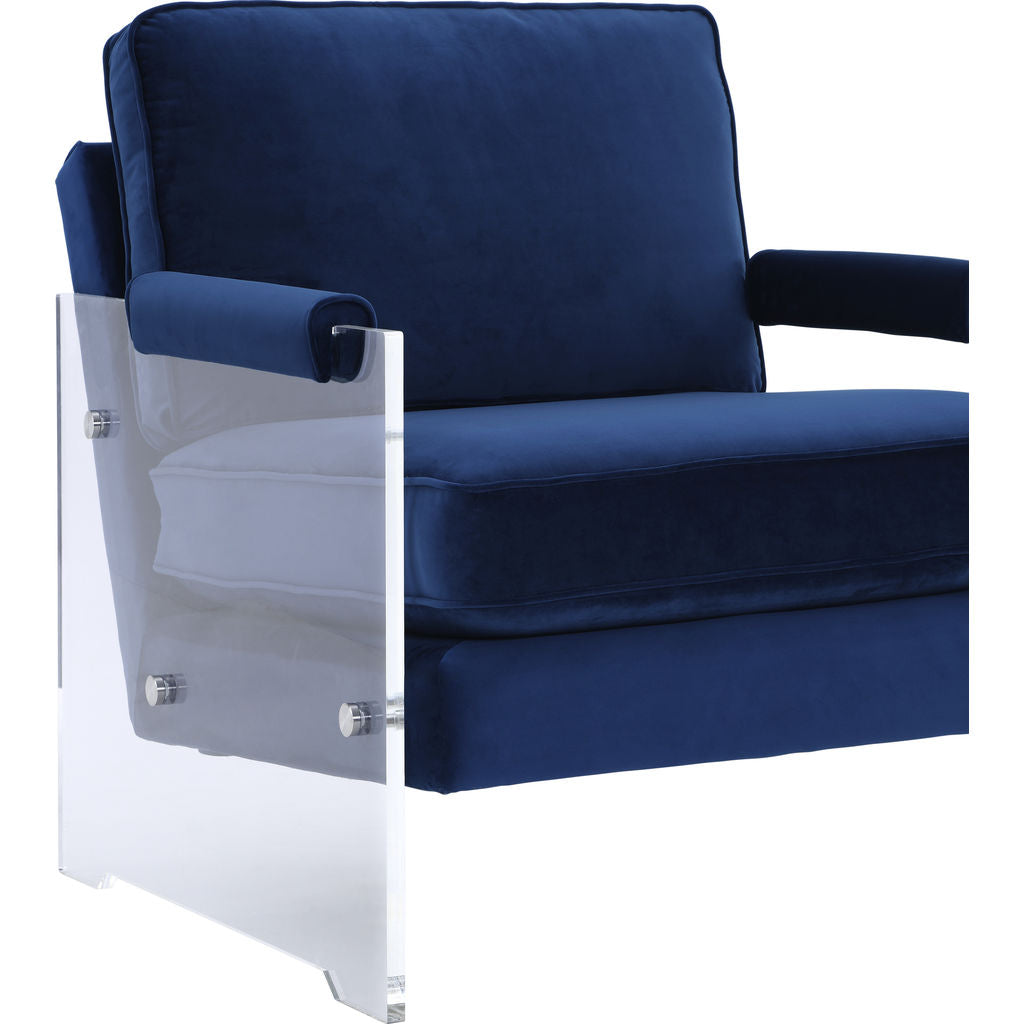 Forming a brilliant synergy of contrasting materials, the navy velvet Serena chair from TOV Furniture is a contemporary recreation of the timeless arm chair. Utilizing a clear lucite frame and arms, this arm chair offers the enchanting illusion of appearing suspended in mid-air. In addition to its remarkable modern design, the Serena is handmade by artisan-like craftsmen to ensure comfort and enjoyment for years to come.