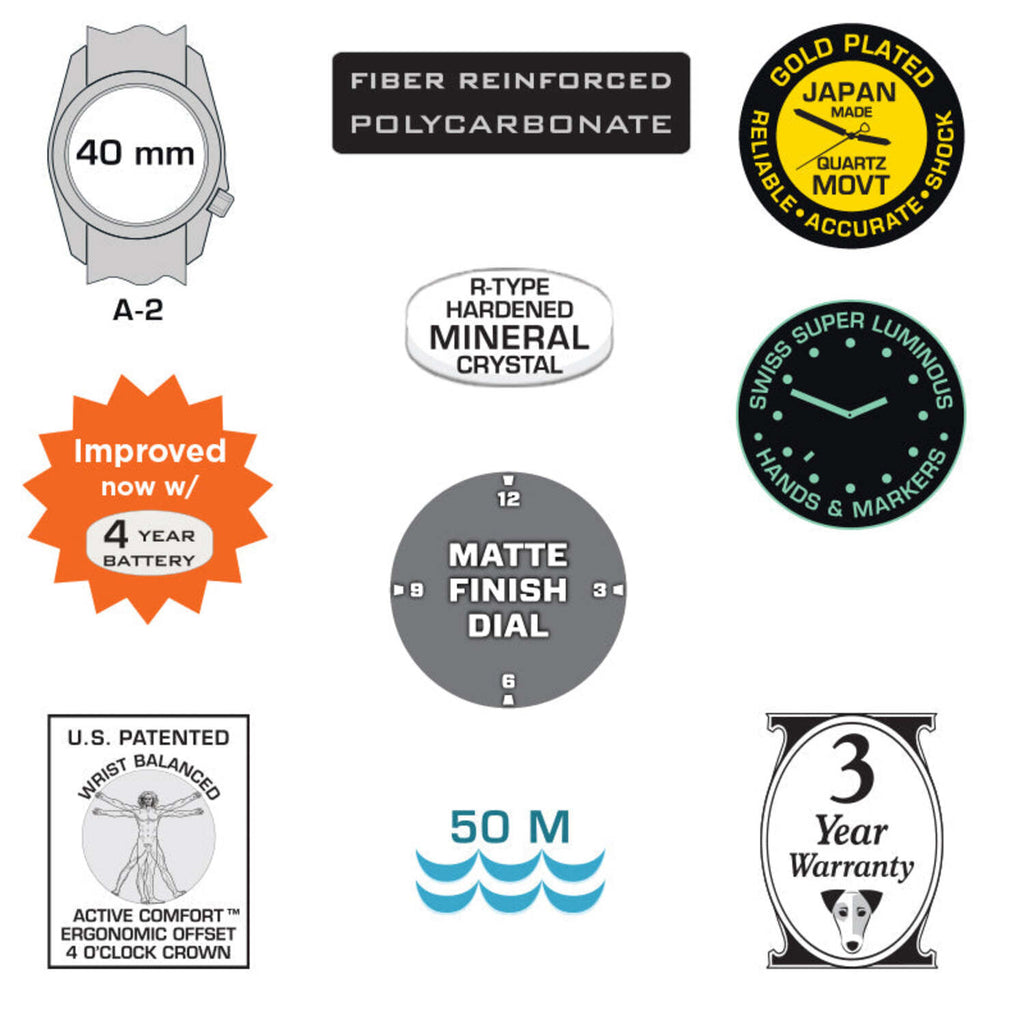The DX3® CAMO™ Series features our legendary U.S. Patented A-2 Unibody™ 40 mm fiber reinforced polycarbonate case. Equipped with authentic U.S. Military, Made in USA, 2-PLY camo webbing. The U.S. Patented band is made from a unique webbing construction that offers unmatched comfort and durability. Additionally, packed with performance features such as precise and reliable all-metal movement, 4 year battery life, 50 M water resistance, Swiss super luminous hands & markers, solid stainless steel crown, case back and band hardware, and scratch resistant R-Type mineral glass crystal.