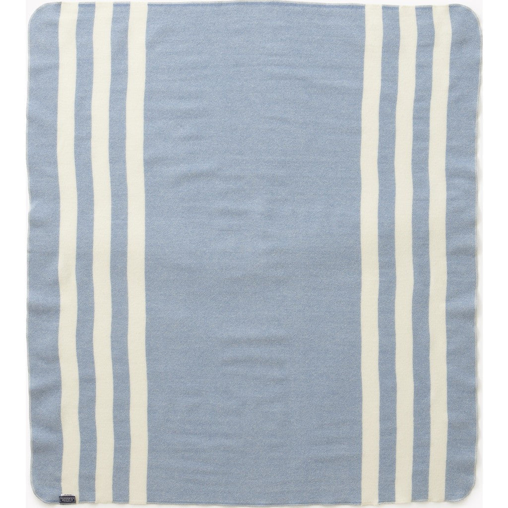Faribault's Baby Trapper Wool Blanket is woven in their softest washable Merino wool to make sure your little one stays cozy. This blanket in Blue and Natural features white stripes and is finished with a serged edge.