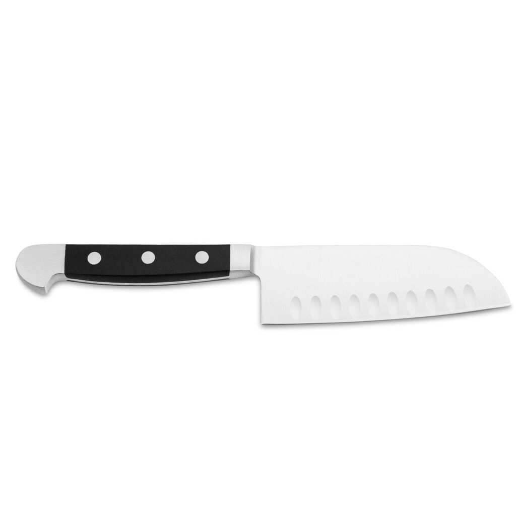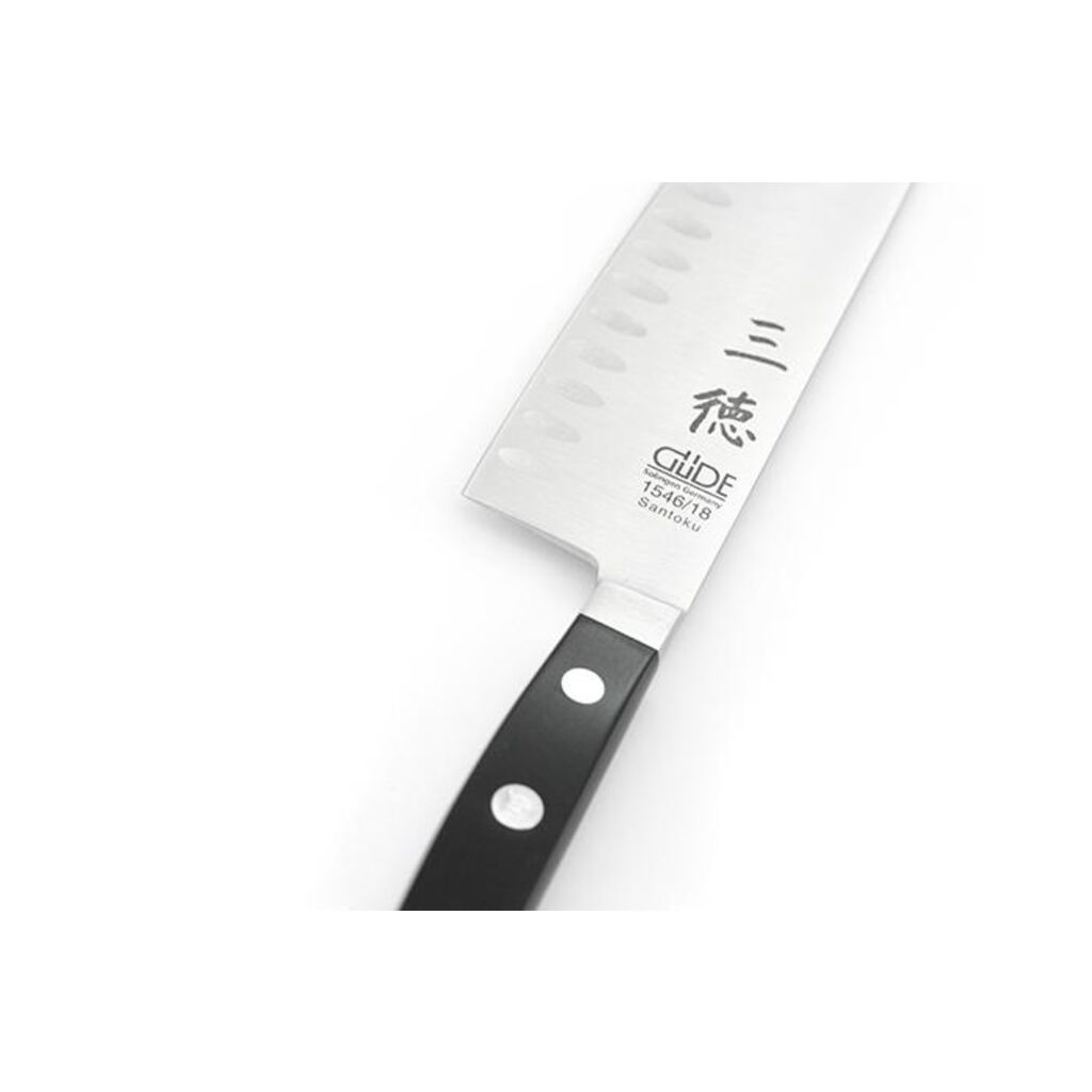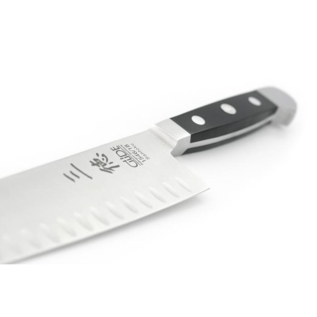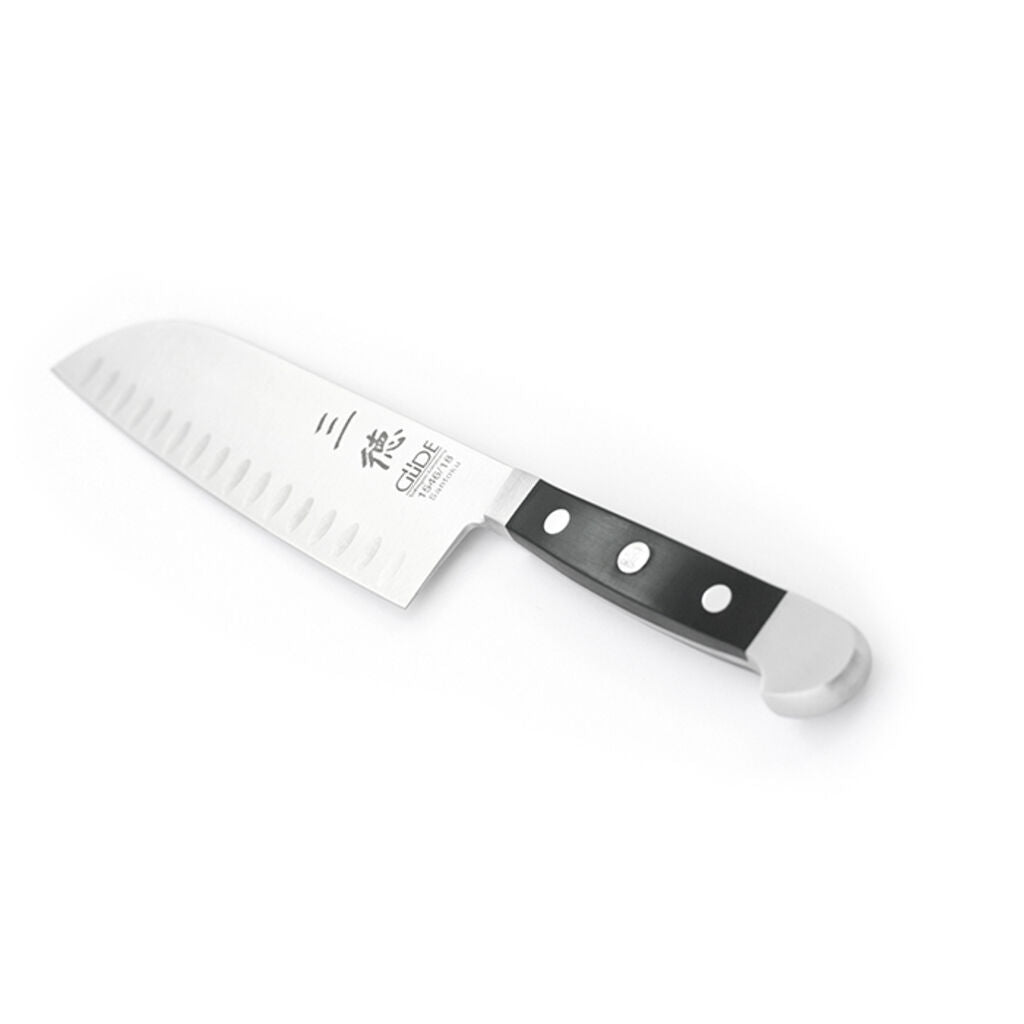 DESCRIPTION: The Alpha Santoku from Gude Solingen is adequate for the European chef's knife. A universal knife that is used in Japanese kitchens for almost all cutting work. In contrast to the European chef knife, it has a wider, straighter blade, which is only slightly rounded at the tip. This is due to the chopping technique preferred in Asia.