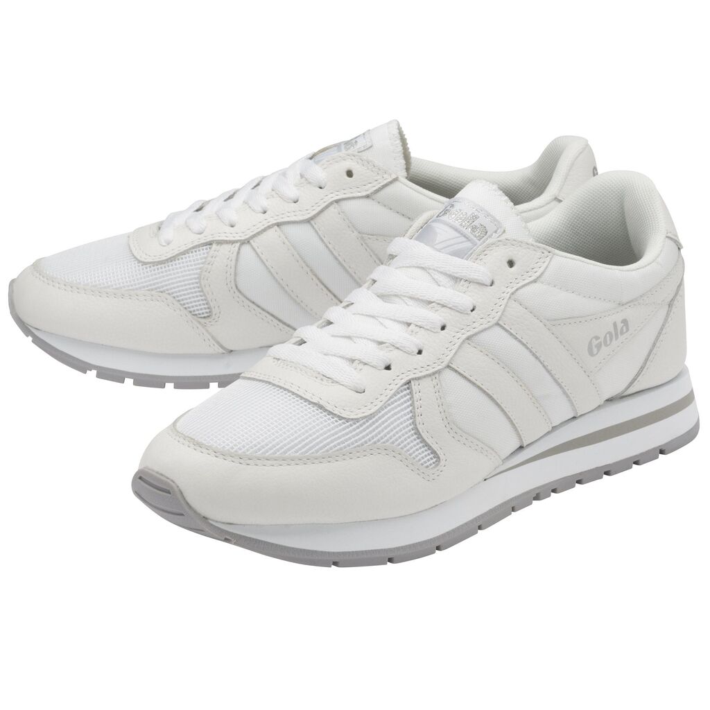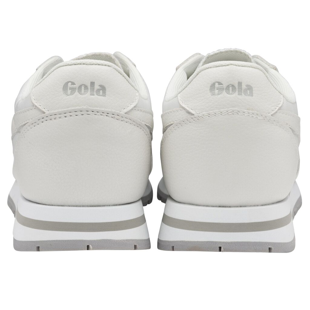 Daytona Leather is a trainer superhero. This '90s men's retro runner, re-imagined from Gola's back catalogue, features an oversized EVA midsole and a mix of open mesh, nylon and leather panels in classic White. Highlighted with a touch of gold Gola branding, there's an air of trainer nostalgia with the new season Daytona.
