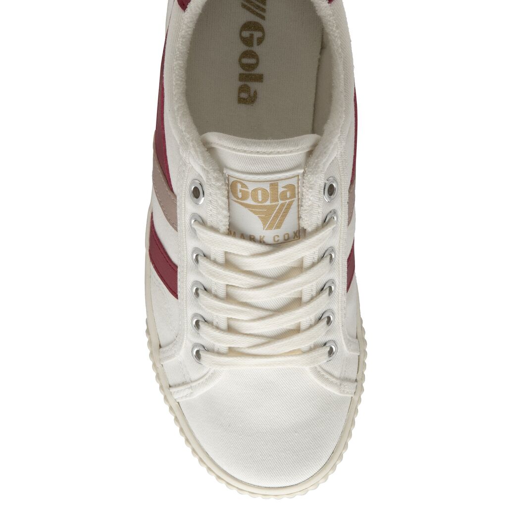 Gola Classics introduces Tennis – Mark Cox. Based on an original Gola style from 1975 that was worn by tennis player Mark Cox, Tennis truly embraces Gola’s long history with racquet sports. This ladies tennis inspired plimsoll features an off-white upper, with a contrasting raspberry wingflash. Gold Gola branding can be seen on the tongue and heel-turn.