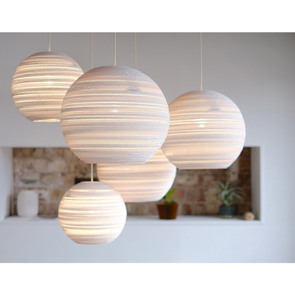 The Moon10 is part of Graypants' Scraplight White series.  This light is made from custom-made, pure white cardboard and can be used in virtually any setting, offering pleasant, practical light with a modern, sophisticated spin on the original natural line.  Each fixture is made using a precision cutting laser, hand-assembled with a nontoxic adhesive, and treated with an environmentally friendly fire retardant.