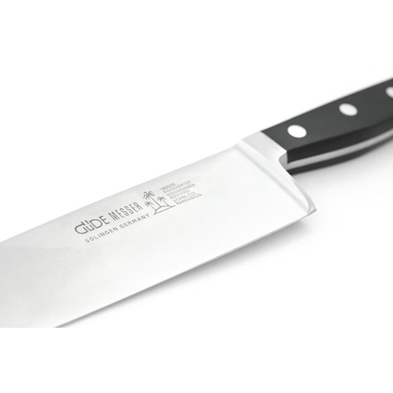 Gude knives are hand-forged in Solingen, Germany from one piece of chrome-vanadium-molybdenum steel, from the blade tip to the double crop. The double crop, a special feature of Gude knives, is a counterweight to the blade. The knife is perfectly balanced. The special mixture of steel and the elaborate manufacturing process with more than 30 manual steps give the stainless steel blades with a hardness of approx. 57 HRC a special robustness and longevity.