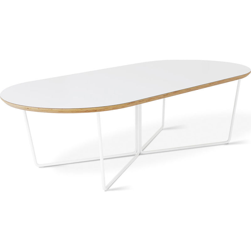 The oval-shaped Array Coffee Table boasts an elegant geometric base that repeats around a central axis, creating a remarkable contemporary aesthetic. The white table top is complete with a beveled, exposed-ply edge and durable laminate surface - a truly striking companion to the minimalistic base. Just one piece of the Array Table Series, the Array Coffee Table nests perfectly with an Array End Table.