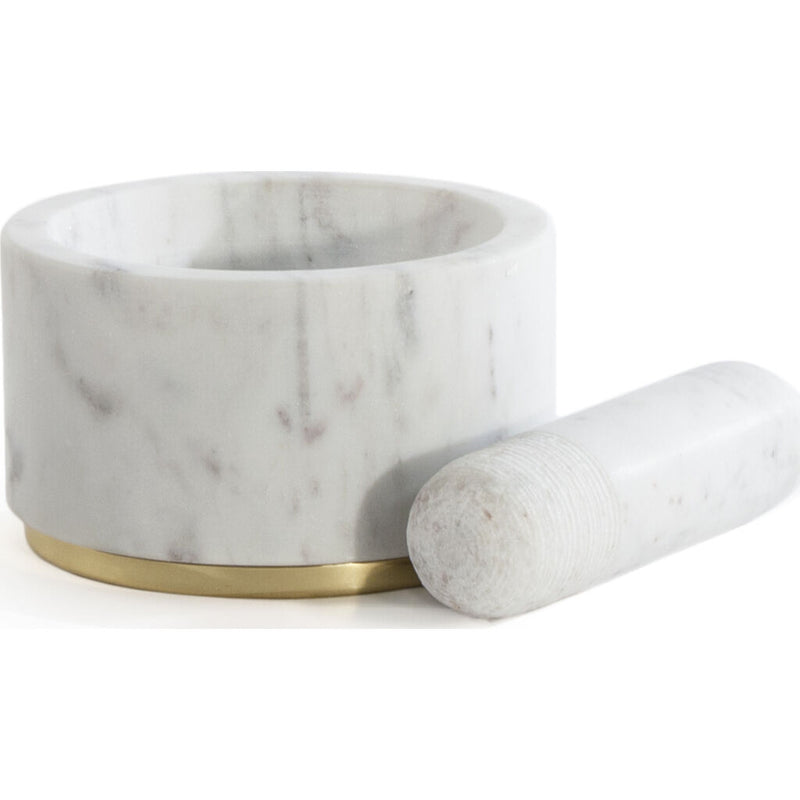 Carved from a solid white marble block and finished with a brass base, the Mara Mortar and Pestle is a beautiful cook's accessory. Hefty in weight, the piece is designed for those who love to cook in style. The marble pestle is ridged at its tip to provide an even application of force to whatever it is you'll be making.