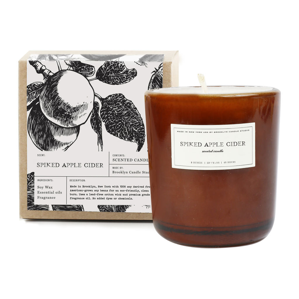 This nostalgic scent is inspired by the soothing comfort of a piping hot cup of cider, garnished with a stick of cinnamon - and of course a splash of bourbon. The Apple Cider Candle from Brooklyn Candle Studio's Amber Apothecary Collection leads with pungent, spicy notes of cinnamon and clove that slowly give way to an alluring heart of earthy cedar and citrusy orange. These Amber Glass Candles have an ethereal glow that offers an atmosphere reminiscent of huddling by a roaring fire in a dimly lit cabin. Each Brooklyn Candle Studio Candle is made by hand in Brooklyn, New York with soy derived from American-grown soy beans.