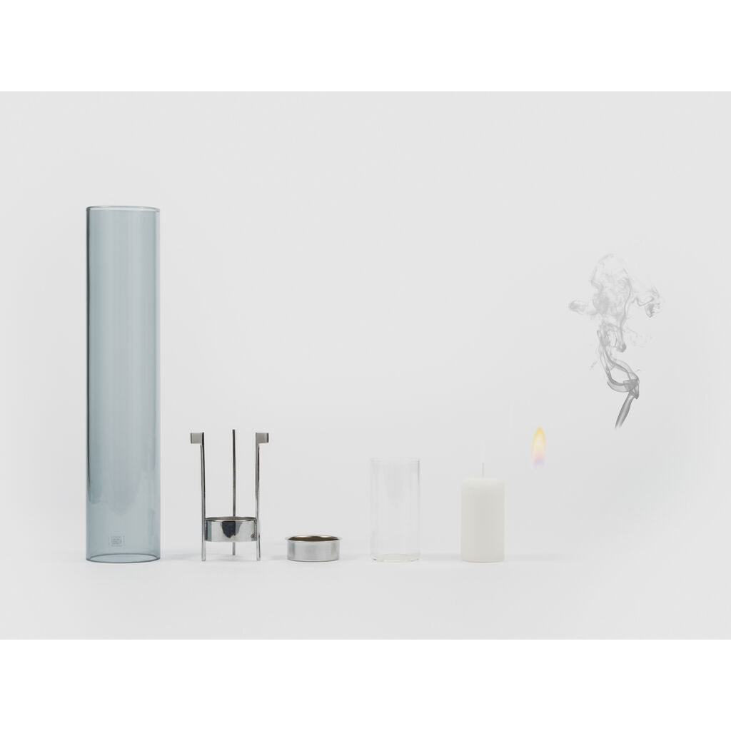 Stromboli is a candleholder that with its lightness, simplicity and intelligent design makes the most of the materials and technology used to make it. A chromed steel holder hangs inside a tall glass cylinder that protects the flame.The vulnerable charm of glass meets the sturdiness of steel in this sophisticated candleholder by Bruno Munari. The cylindrical body in transparent glass houses a tiny element in chromed steel functioning as support for the candle. Setting a relaxing ambience in any context, this elegant candleholder will create delicate, flickering reflections onto the glass.