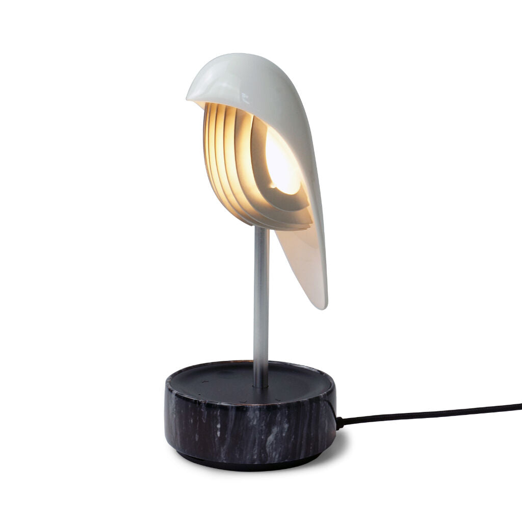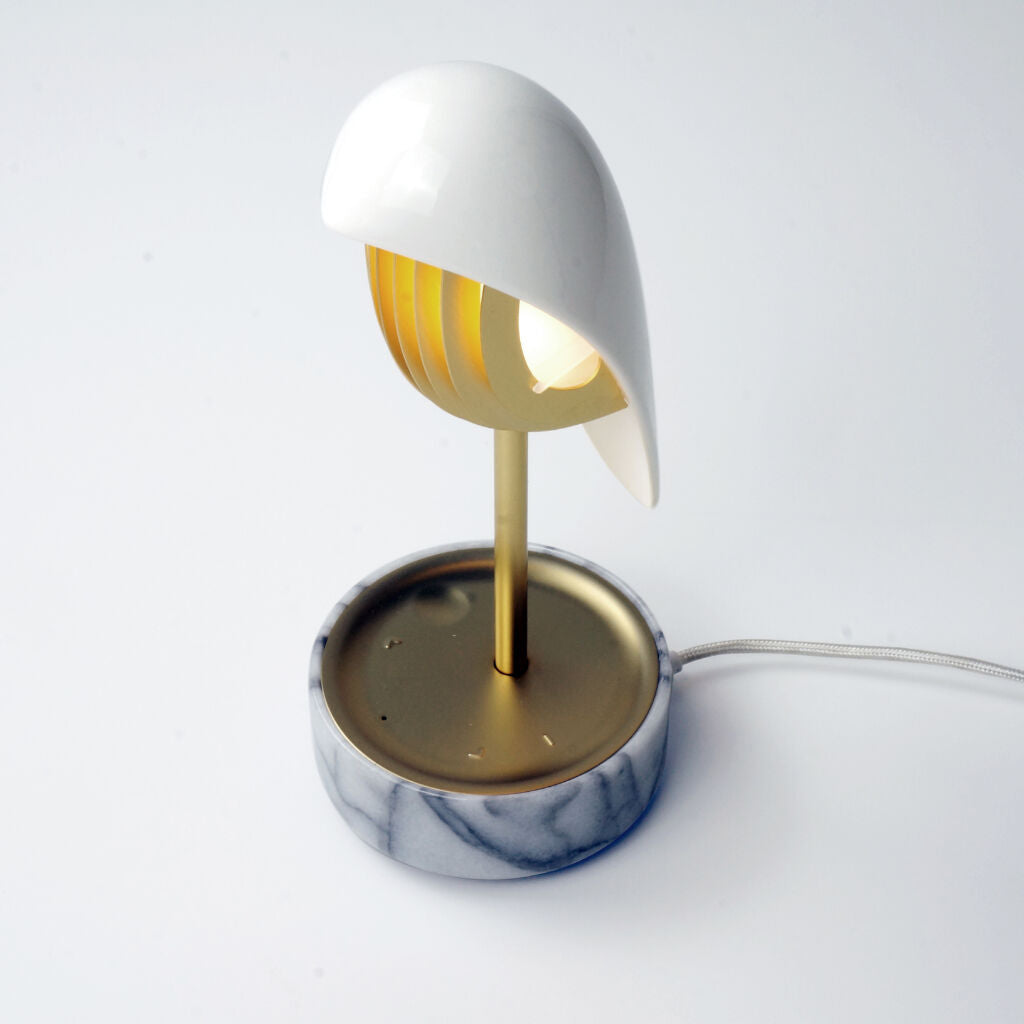 The Chirp White Gold has an elegant white hand-crafted porcelain bird cover and a white marble base made from natural stone. Each base will have a unique pattern due to the natural materials used. Complemented by gold finishes.