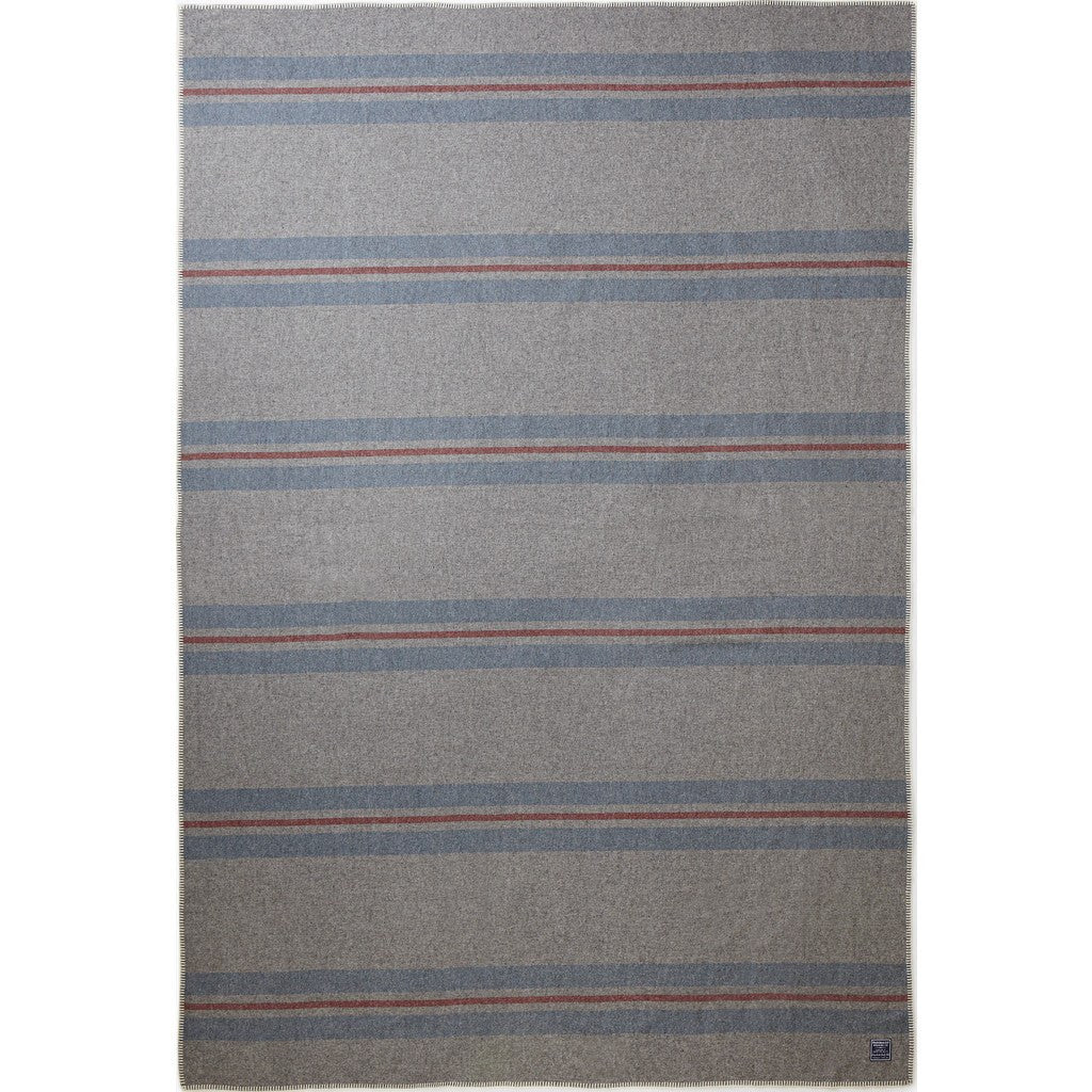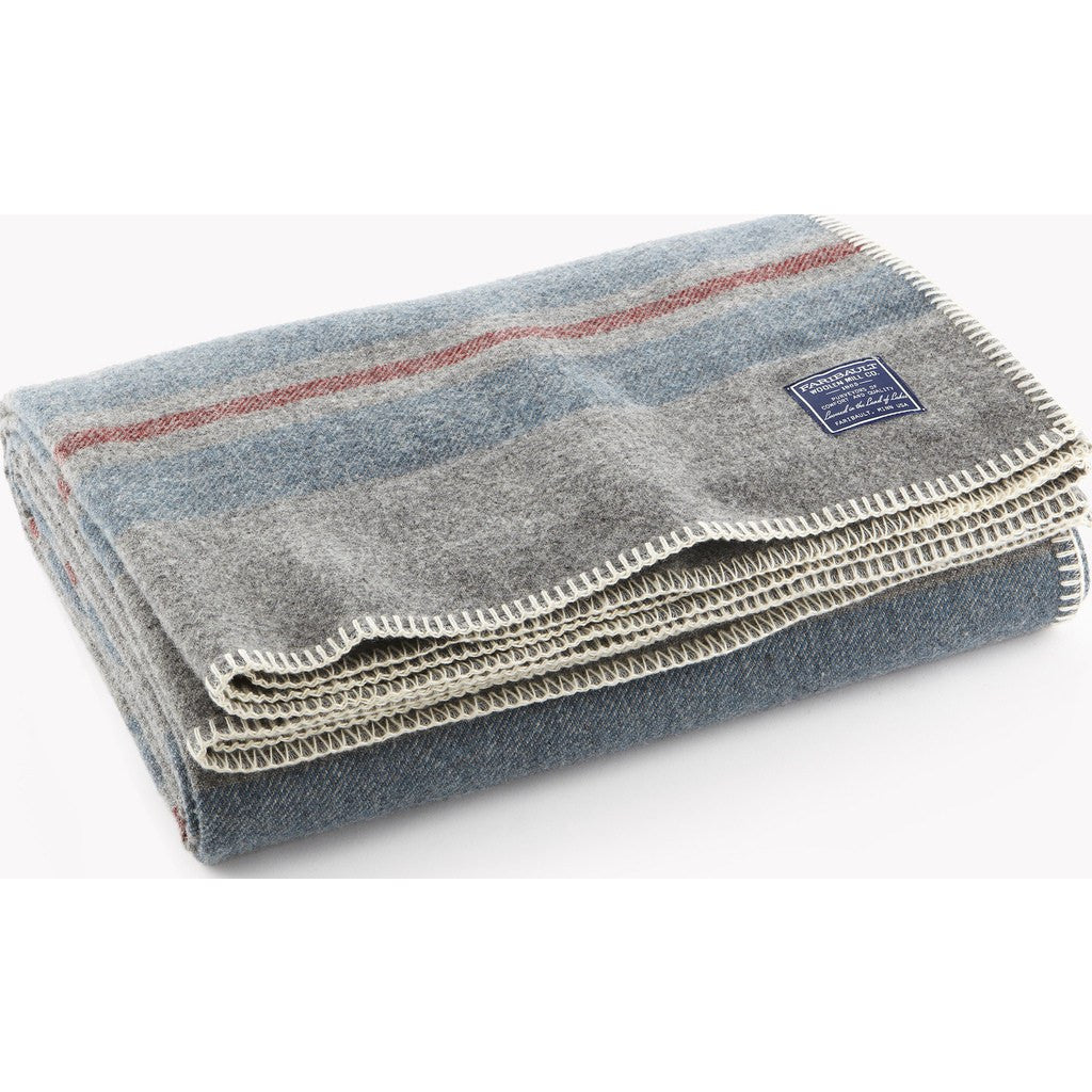 Faribault proudly brings you the Cabin Wool Blanket. Crafted with 100% Merino wool, this Gray, Blue and Red blanket has become a favorite. The Cabin Wool Blanket is finished with a whipstitch edge and comes in three sizes.