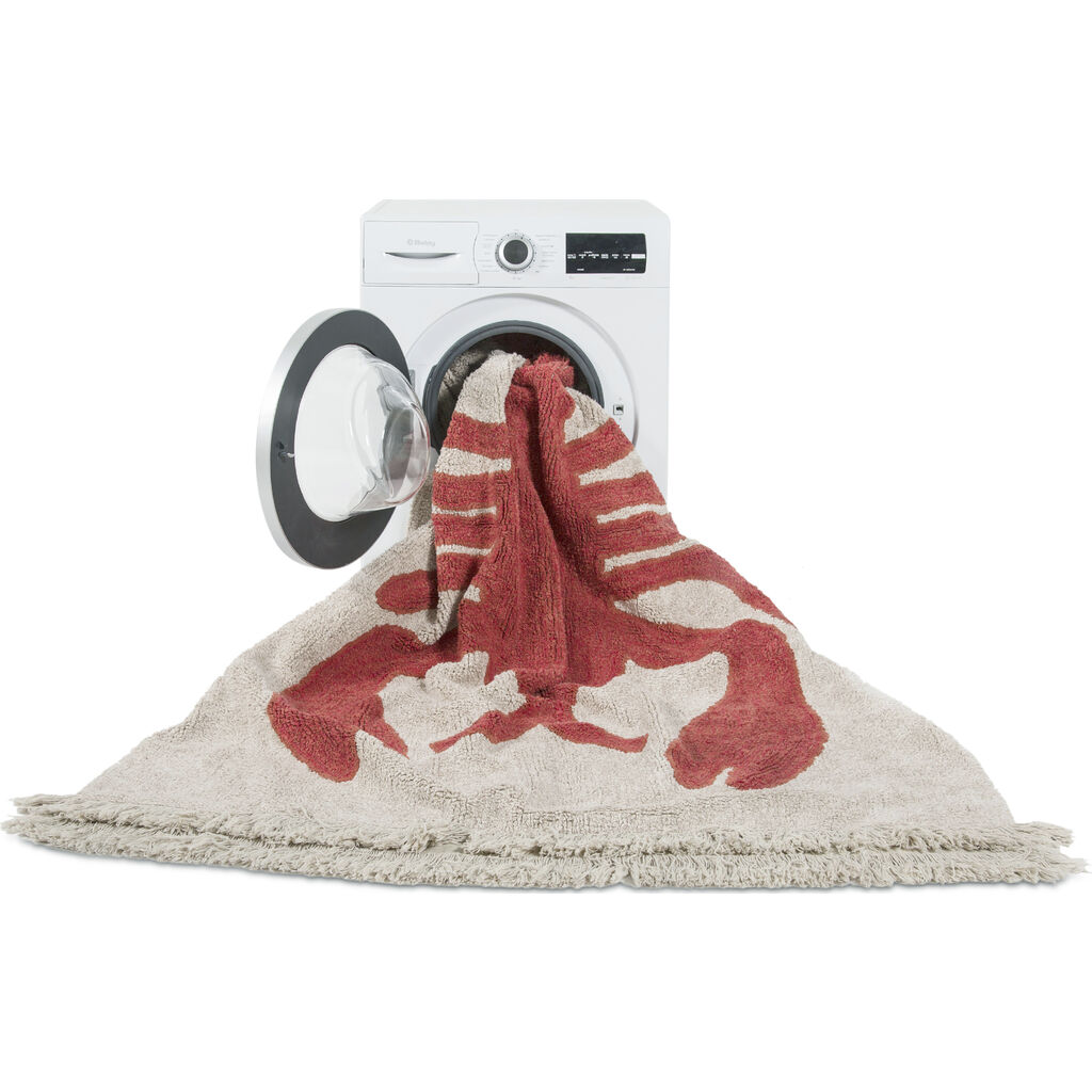 If you are a real sea lover who wants to feel the softness of the white sand and brings the ocean breeze, you cannot miss the new washable rug with a big central Lobster. This artisanal rug has been made in Natural and Soft Linen mixed yarn, finished with two rows of self-fabric fringes at both edges. The intense reddish tones of the Lobster add a whimsical touch to the simple designs of natural color. The marine style of this washable rug makes it perfect to decorate childrenïs room or any corner of the home. You could find small differences in each artisanal rug, for this reason not two rugs are the same.