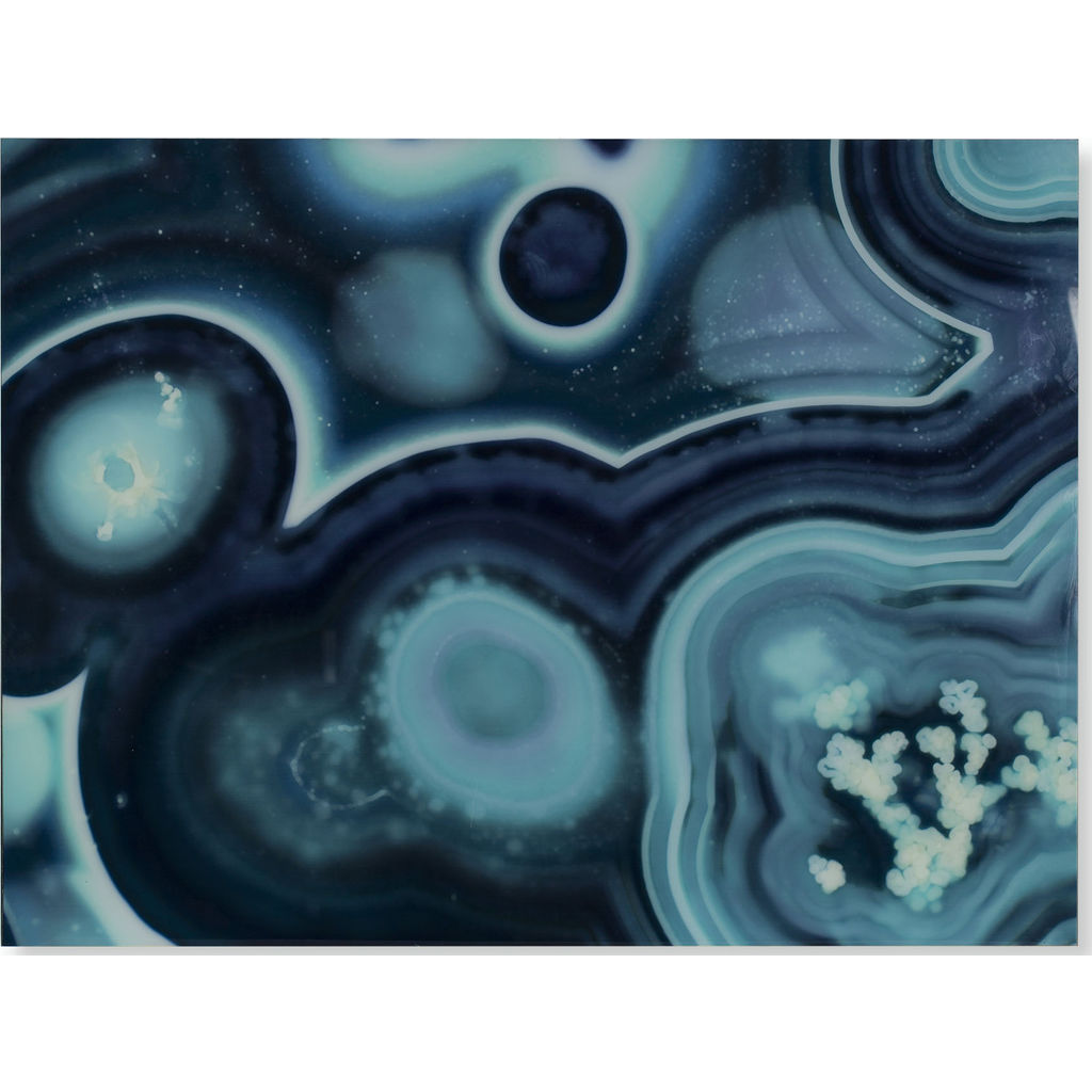 This striking abstract image was captured by photographing of a piece of cut agate geode that has been zoomed in - revealing striking colors and unique forms. The Agate Wall Panel B from Resource Decor is printed on glass with a wall mount. Combine with the other 3 variations to create a seamless pattern of free flowing forms and deep shades of blue.