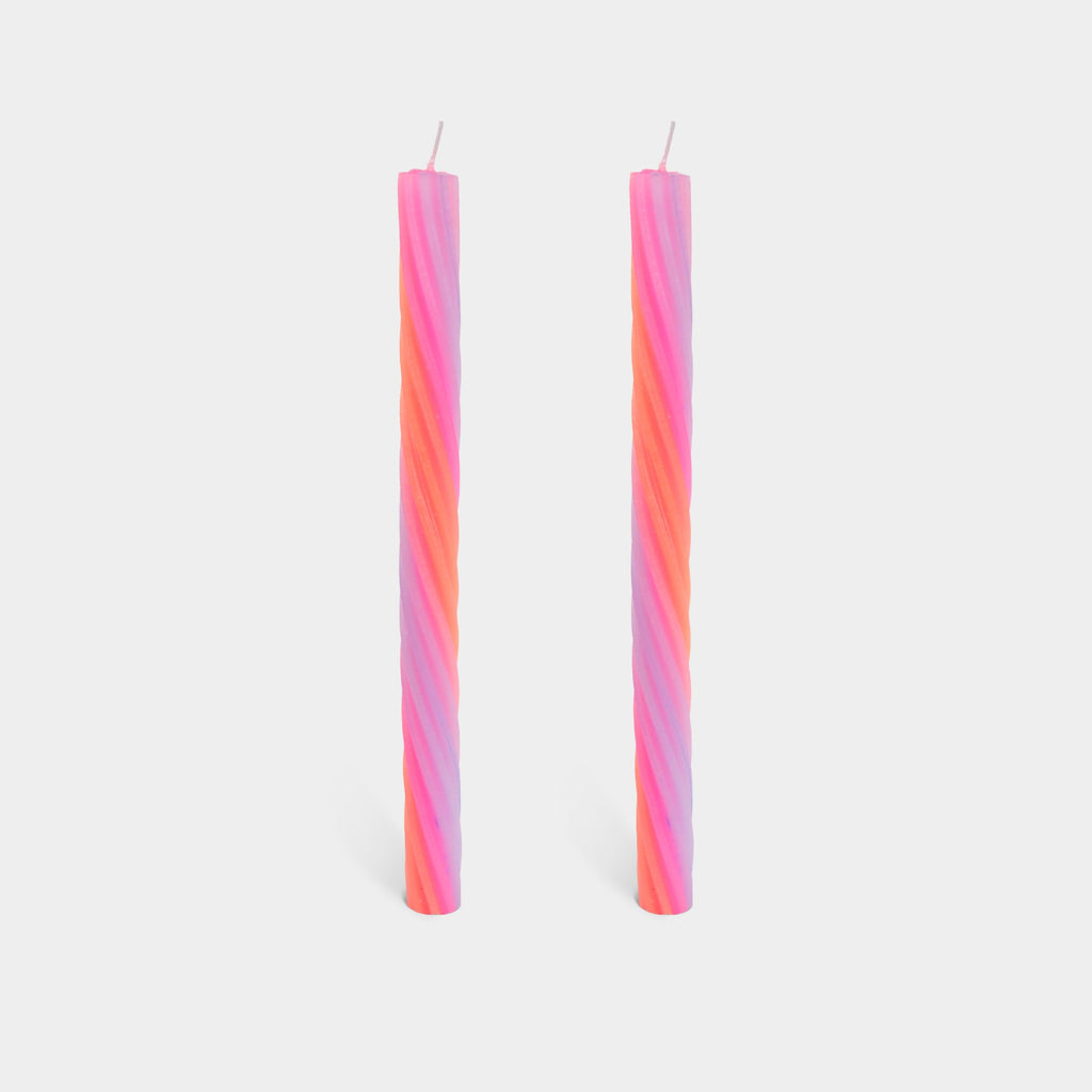 Rope Candles are about texture and depth. By playing with the production method we created bright color combinations that are woven together into a multi-colored spirals. Rope candles fit in a standard size candleholder. Candleholder not included.