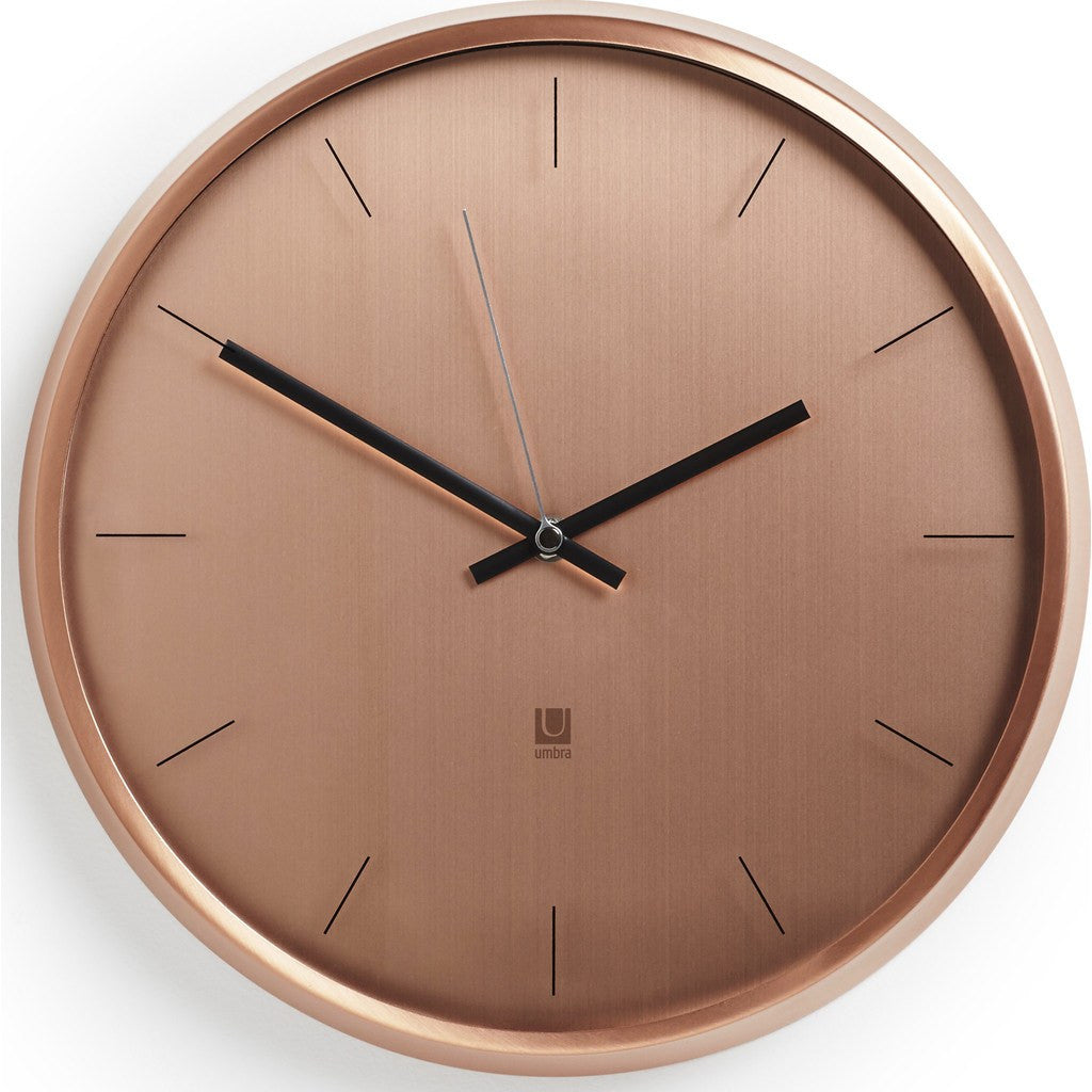This elegant yet understated clock blends an industrial aesthetic with soft lines for a unique and versatile look. An all-metal face and frame in copper with minimalist numerals and hands really gives a sophisticated vibe that is sure to complement any space.