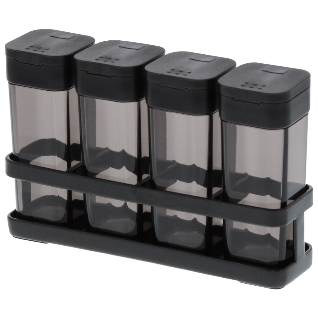 Our spice bottles are designed for ultimate ease of use. The tops are sliding so that you can open bottles with one hand, and they are equipped with spouts for sprinkling or pouring. The streamlined matching rack has a silicone bottom.