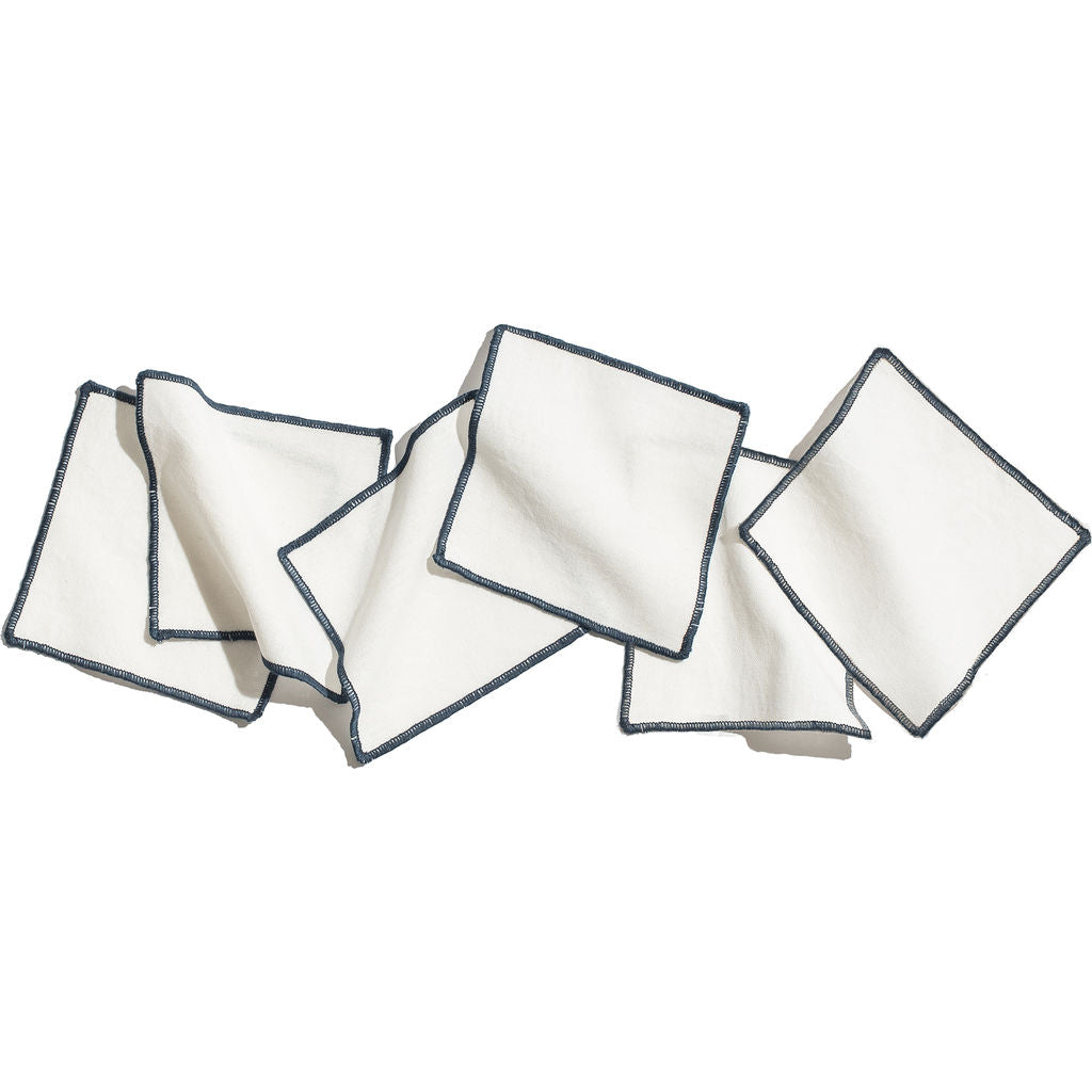 Zestt's Deep Sea Monterey Set of 4 Organic Cotton Cocktail Napkins are timeless. These are minimalistic white linen napkins with a dark blue boarder to add just the right amount of color. A perfect addition to any place setting, no matter what your style is. Great napkins for monogramming.