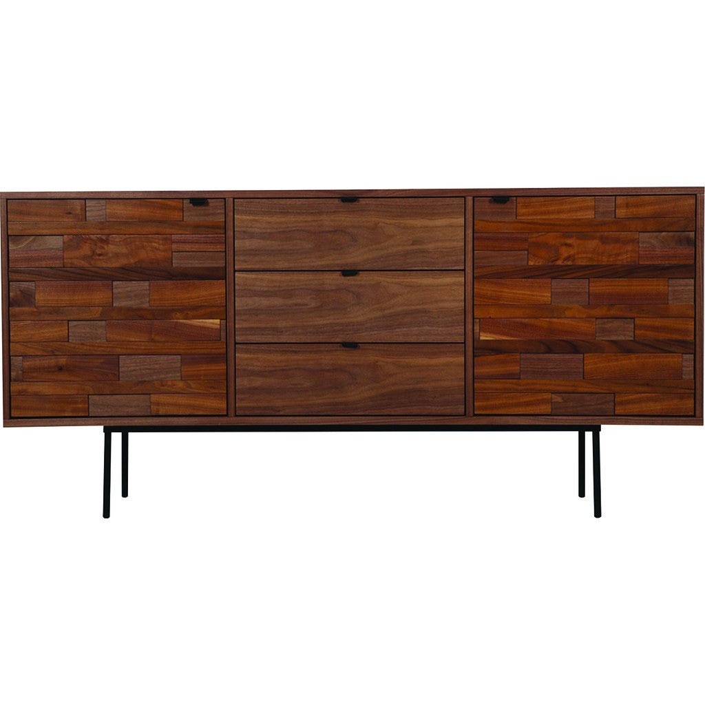 The Pasadena Credenza is a highly innovative piece by ION Design, featuring a gorgeous multi-layered dimensional effect on the paneling that sets this unit apart. This multileveled paneling is on the two large cabinets, while three smaller ones feature smoother wood paneling, and the top yet another shade, creating a series of contrasts. Finally, leather handles accentuate the piece, providing a touch of class and old-school craftsmanship.