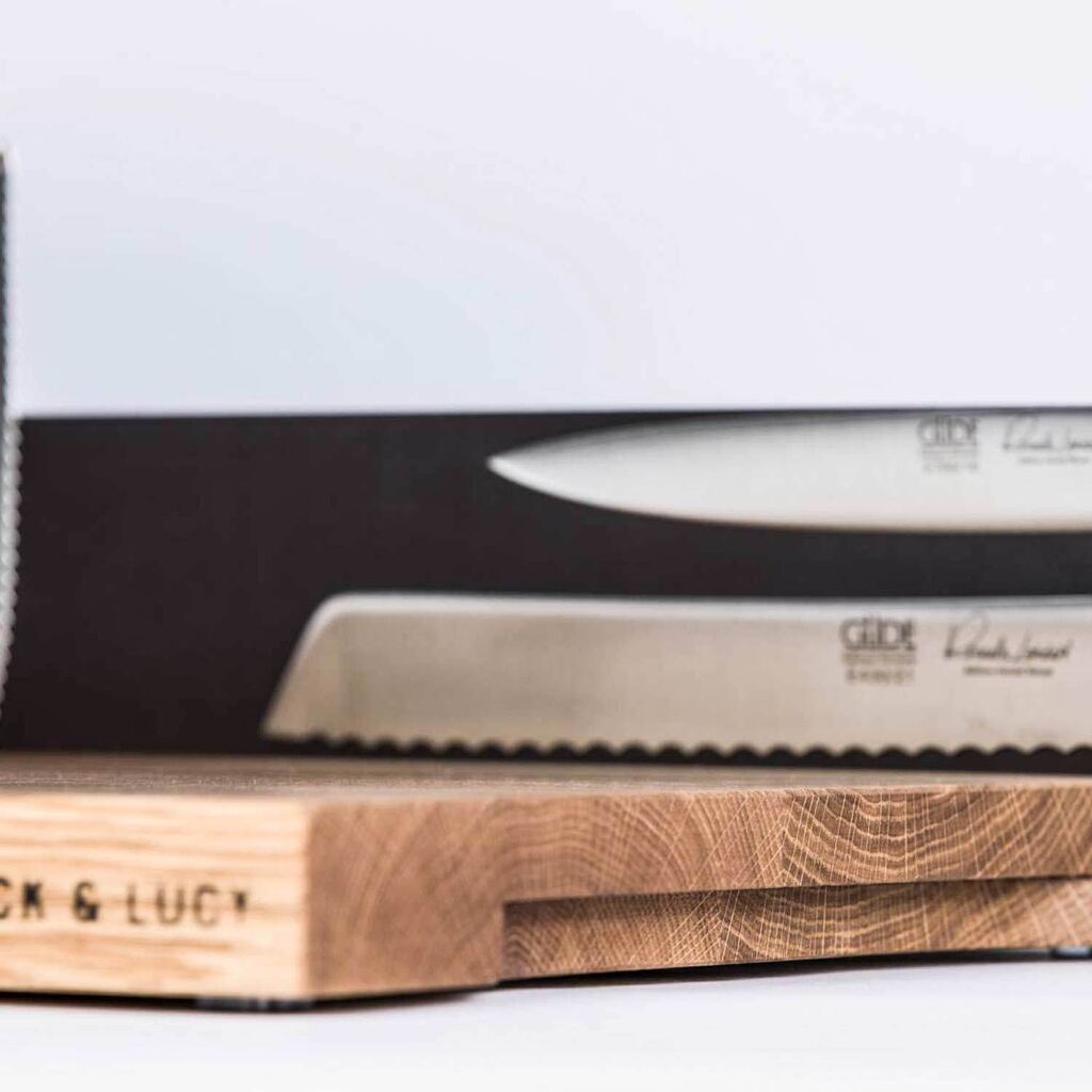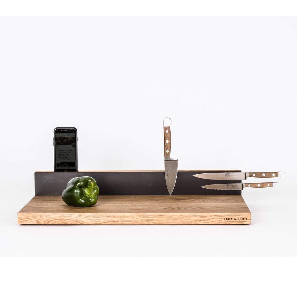 Jack & Lucy presents another multifunctional cutting board after the workstation ONE. Generous cutting surfaces in finely ground and food-safe oiled oak, magnetic knife holder and tray holder for mobile devices together form an elegant, contemporary tool for the modern kitchen.