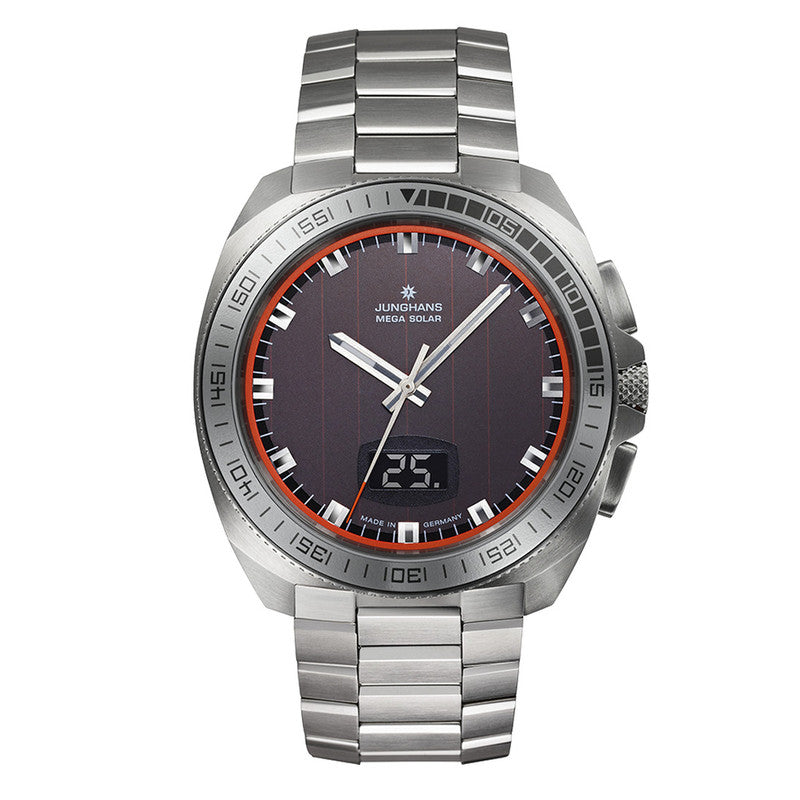 The design language of the 1970s has lost none of its fascination to this day. This is also demonstrated by the 1972 Chronoscope Solar: The flat shape of the case is characteristic, the orange colour accents are eye-catching, the square appliqués on the dial are striking and the overall look is sporty. As contemporary as it is sustainable: the watch with solar power.