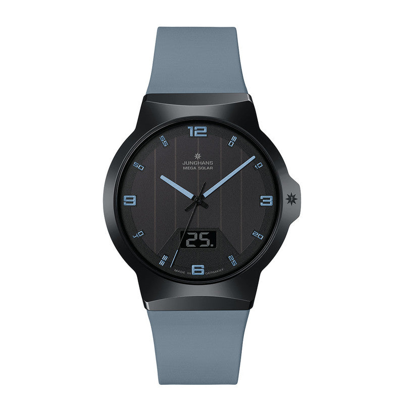 Junghans is a pioneer in radio-controlled watch technology and is also at the forefront of solar energy for watches. These two technologies are combined in the Force Mega Solar model. The Connected radio-controlled solar movement calibre J615.84 draws its energy from a power reservoir that is continuously charged by solar cells in the dial. The entire device is housed in a ceramic case that is both lightweight and scratch-resistant. This watch combines high wearing comfort and coolness with enormous everyday usability.