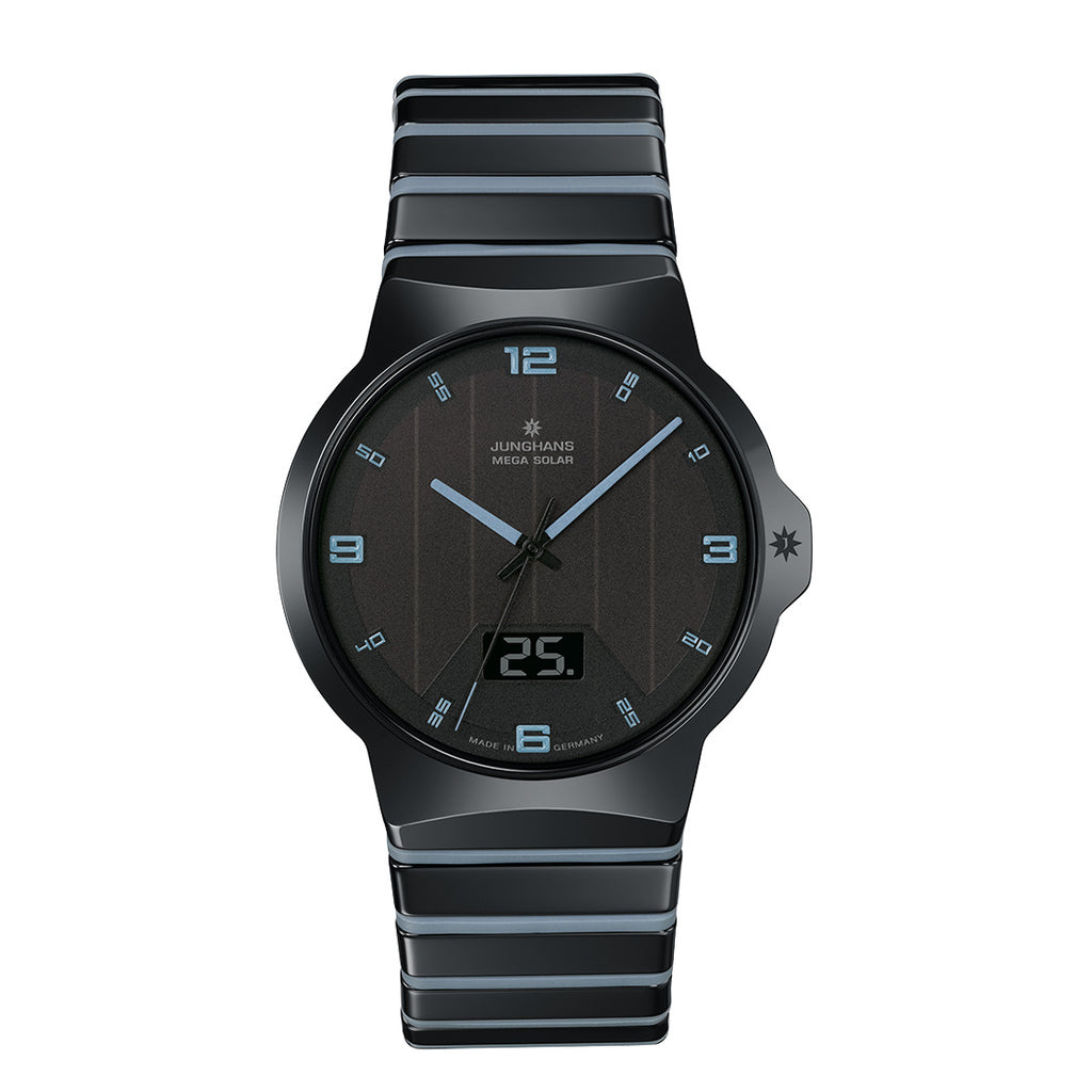 Junghans is a pioneer in radio-controlled watch technology and is also at the forefront of solar energy for watches. These two technologies are combined in the Force Mega Solar model. The Connected radio-controlled solar movement calibre J615.84 draws its energy from a power reservoir that is continuously charged by solar cells in the dial. The entire device is housed in a ceramic case that is both lightweight and scratch-resistant. This watch combines high wearing comfort and coolness with enormous everyday usability.