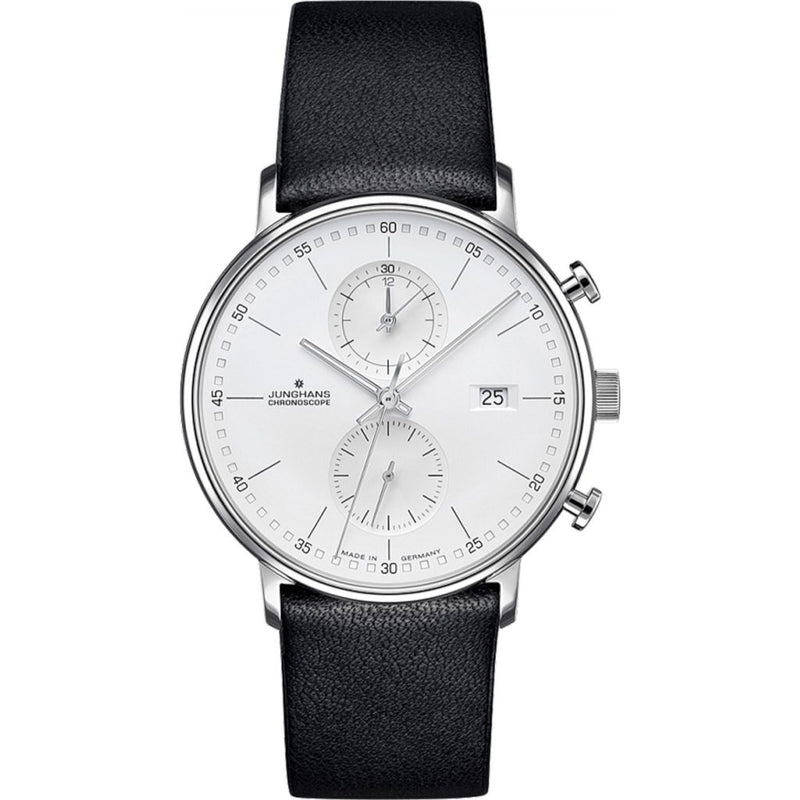 The Form C Chronoscope Quartz Matt Silver Watch with lines in a Black leather strap from Junghans showcase luxurious designs with their 041/4775.00 model. Part of the Form C Chronoscope collection, each watch is silver plated in a stainless steel case with sapphire crystal. The calf leather band gives all-day comfort and multi-function dial makes it easy to read. Crafted with Junghans' signature Quartz movement, this watch is both elegant and functional for everyday use. From business to cocktail hour, this watch will be a show-stopper.