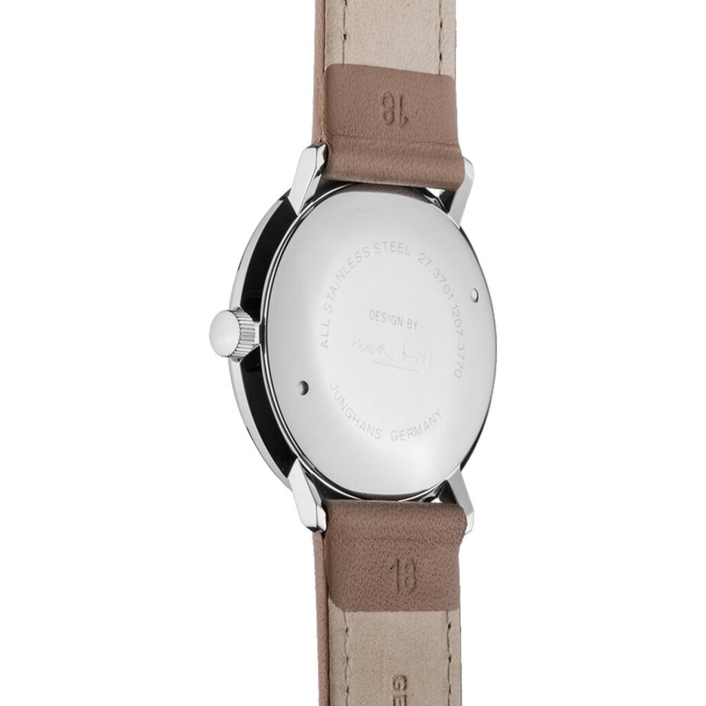 Mechanical Hand-Winding Watch polished stainless-steel case, back and clasp, calfskin wriststrap, white dial with luminated hands, water protected by Junghans. A lovely light brown calfskin strap and stainless steel case encompass this lustrous Matt silver plated watch face displaying legible numerals. As one of the most extraordinary designers of the last century, the architect, sculptor and product designer Max Bill left behind a rich life's work, including one of the most fascinating watch collections of recent.