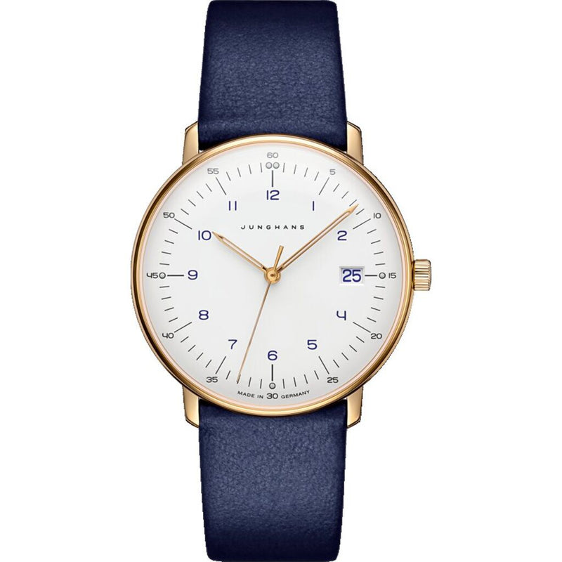 Junghans Max Bill 047/7851.00 ladies in the version. As one of the most extraordinary designers of the last century, the architect, painter, sculptor and product designer Max Bill left behind an extensive life's work, including one of the most fascinating watch collections of recent decades. A lovely blue calfskin strap and matt white coloured minute track and hands with environmentally friendly luminous substance. Superior timekeeping, style and versatility are what you can expect from this hand wound Max Bill watch. Beautiful modern display, stainless steel case complete the look.