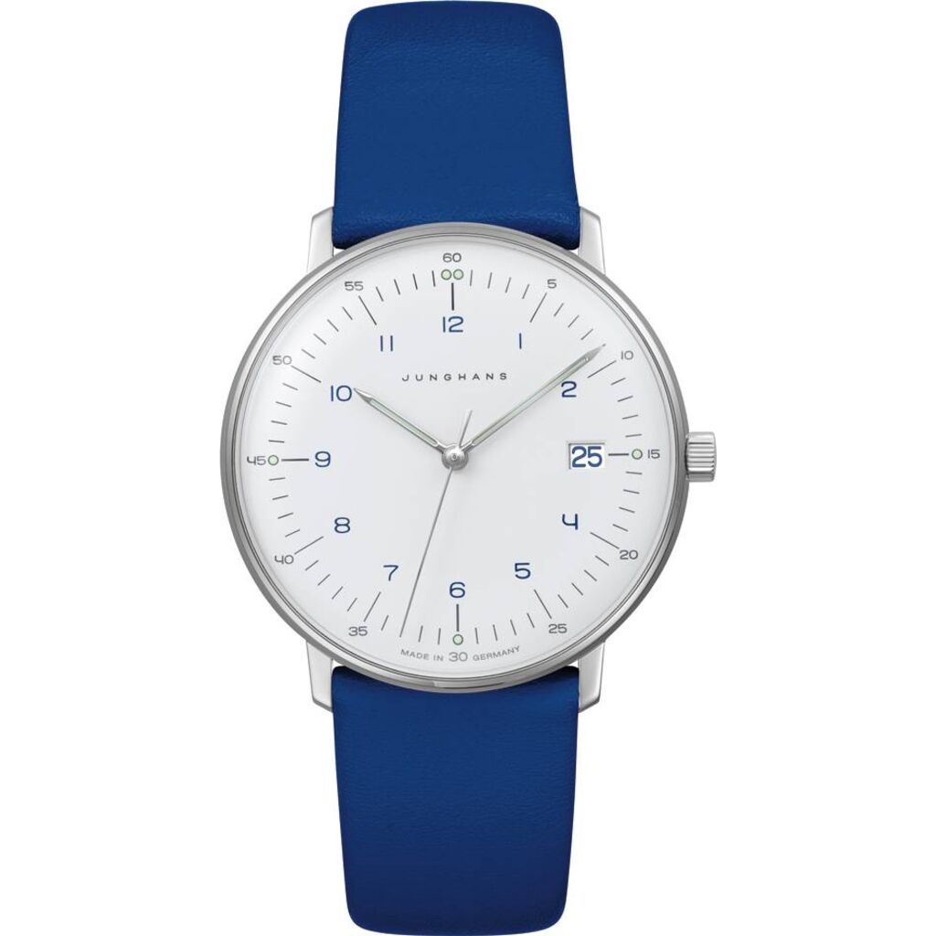 The Junghans Watch Form Max Bill Quartz 047/4540.00. As one of the most extraordinary designers of the last century, the architect, painter, sculptor and product designer Max Bill left behind an extensive life's work, including one of the most fascinating watch collections of recent decades. The Blue color of this calfskin strap will brighten your style. The classic numeral dial displays date on a beautiful white polished dial.