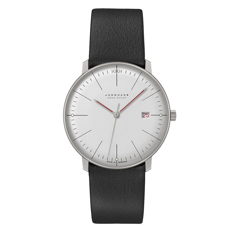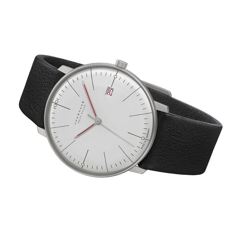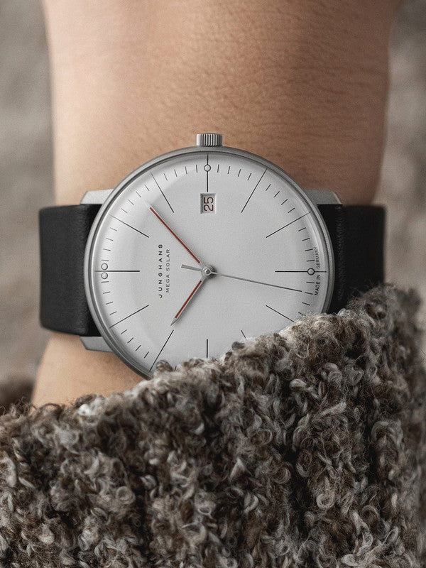 The Junghans Max Bill Mega 59/2326.02 is equipped with a solar-powered in-house J101.85 movement with 6 jewels that is radio-controlled, so you can rely on maximum precision throughout its use. The radio control of this movement is multi-frequency, which means that it picks up the signal on five radio transmitters located around the world. Even if you are out of signal range, the J101.85 achieves extremely high accuracy - specifically +/- 8s per year. Time adjustment is also possible via smartphone using the Junghans MEGA App. This movement also offers a perpetual calendar function without the need for correction up to the year 2400, even without radio signal reception. The date display is located at the 3 o'clock position and its numeral is rendered in red, referring to the red door of the Bauhaus Academy in Weimar. The running reserve on a full battery charge is approximately 3 years.