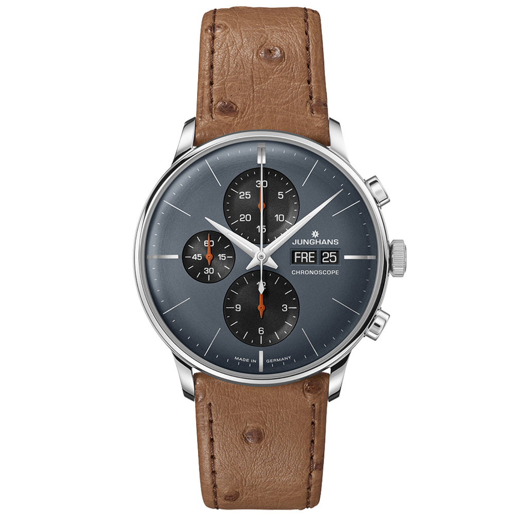 The Junghans Meister Chronoscope 27/4224.02 is an elegant men's timepiece based on the J880.1 automatic movement bearing 25 jewels with a 48-hour power reserve. The gray PVD-coated stainless steel envelope houses a blue dial complemented by a day-of-the-month, day-of-the-week, chronograph and indexes and hands, which are coated with an environmentally friendly fluorescent layer. The dial is protected by convex sapphire glass with double anti-reflection. The whole is complemented by a brown ostrich leather strap.
