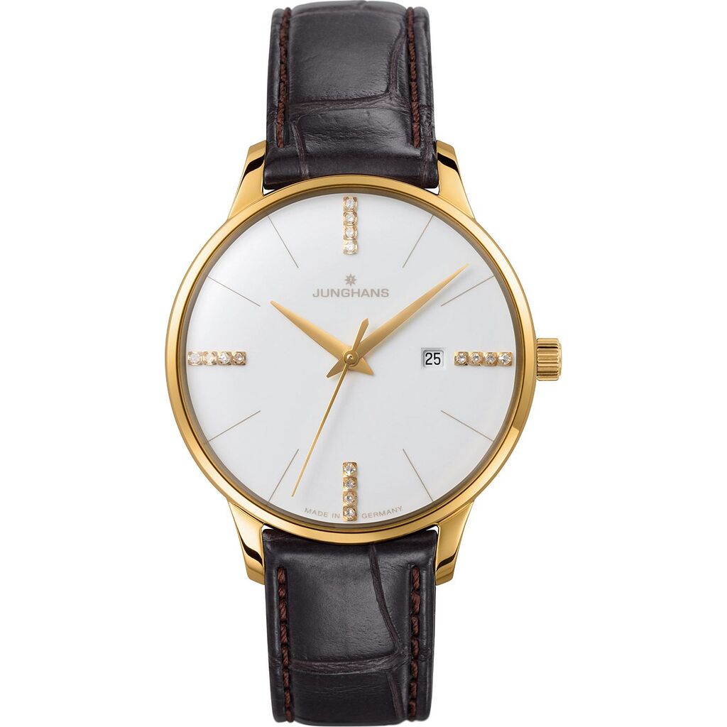 Junghans Meister Ladies Date 047/7374.00 is a truly gorgeous and stylish watch. Under the hood you will find the mechanical quartz movement Junghans calibre J840.1. The glass is sapphire crystal with anti-reflection coating on both sides. This coating helps protect the otherwise relatively vulnerable sapphire crystal against scratches. The Meister timepiece is an example of truly masterful craftsmanship, delivering an impeccably smart and smooth look like no other. This expertly crafted hand-wound watch is a stunning compilation with a rich beige python leather strap with additional strap alligator and stainless steel PVD coated case and Polished white dial with 16 diamonds. 30 metres water resistancy will protect the watch and allows it to be worn in scenarios where it is likely to be splashed but not immersed in water. It can be worn while washing your hands and will be fine in rain. The feminine adaptation of the historic classic appeares even more exquisite. The elegantly curved lines and gentle proportions underline the dynamic character of the watch.
