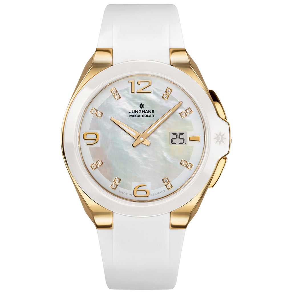 Cool stainless steel, scratch-resistant ceramics and waterproof up to 10 bar, the Spektrum Damen is our sportiest radio-controlled watch, designed to be worn by active and independent women. The Junghans multi-frequency radio-controlled movement guarantees ultimate precision, and is powered solely by the energy of the sun. Not only has the Spektrum Mega Solar proven itself to be incredibly accurate, but is also an extremely eco-friendly timekeeper requiring fewer resources and specially designed for a feminine wrist.