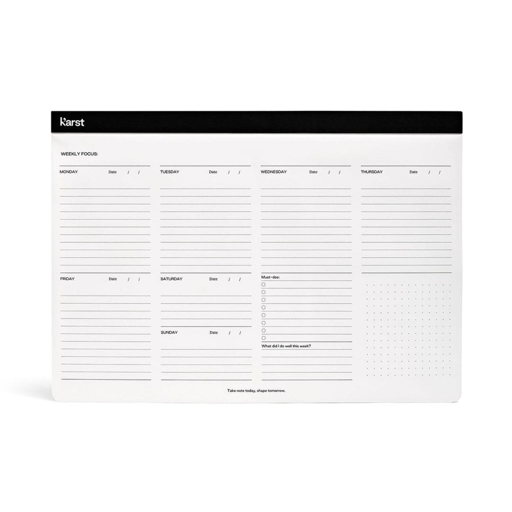 Our Weekly Desk Pad is undated, making it the perfect home for appointments and meetings year-round. With space to track your non-negotiable tasks for the week, a weekly reflection, and a dot grid area for sketches or notes, stay on top of it all with ease. Perfect for everyday use. 60 undated pages with days of the week, a dot grid area for sketches or notes, micro-perforated pages for easy removal, black top flip binding, black waterproof back cover and pages.
