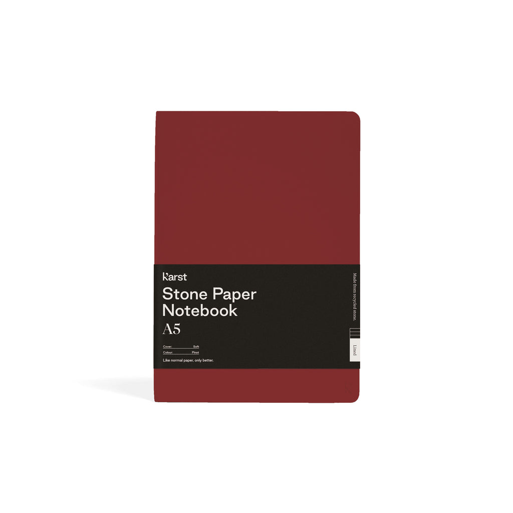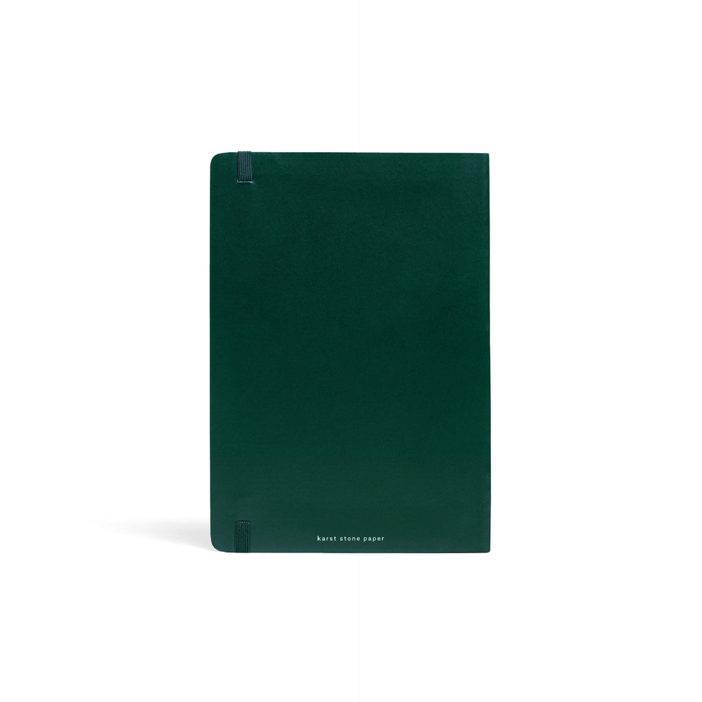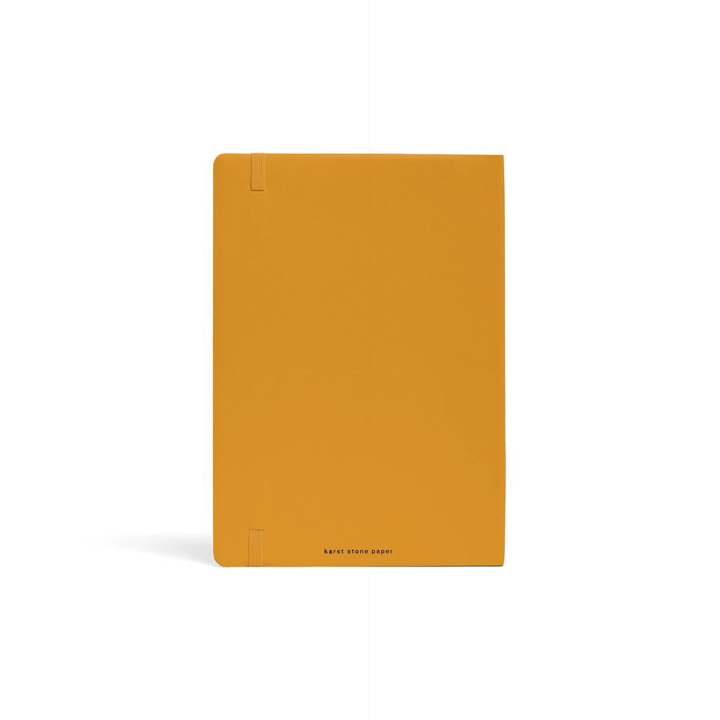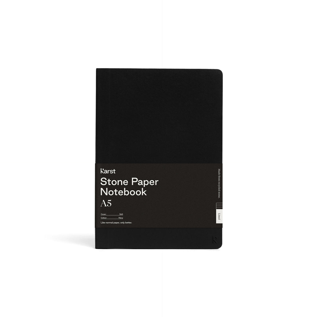 The most premium notebook in the Karst collection. This tree-free A5 Softcover Notebook is made from high-quality, sustainable, and recyclable stone paper with a flexible vegan leather cover. Thoughtfully designed with an expandable back pocket for extra storage, a divider ribbon that doubles as a bookmark for easy reference, and lay-flat binding for comfortable writing. The perfect low-tech companion to your high-tech devices. 144 blank pages, lay flat binding, waterproof cover and pages, color matched elastic closure band and divider ribbon, expandable storage pocket inside back cover.