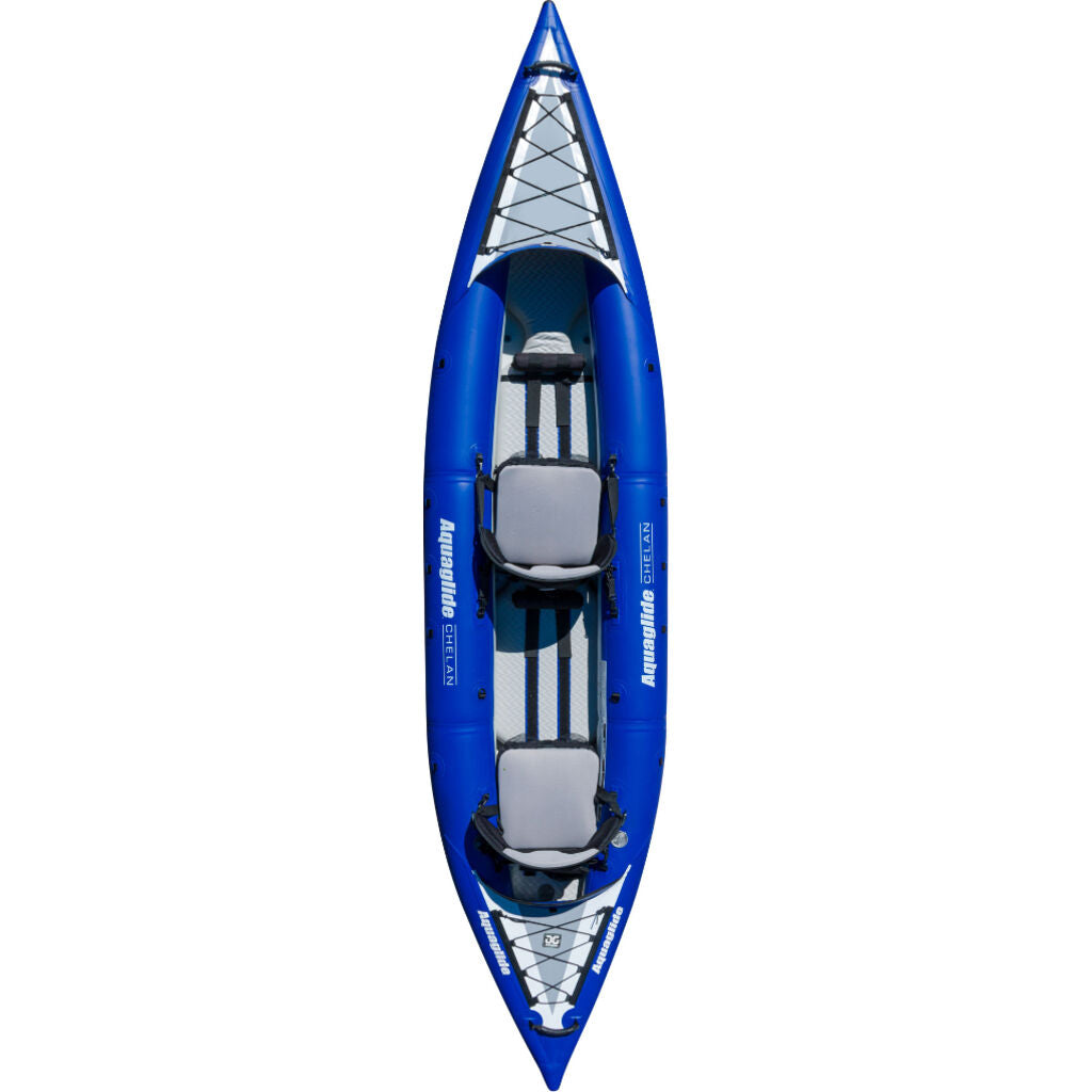 - Includes: 1 Chelan Kayak, 2 Pro-performance seats, 1 Quick-Release Fin, 2 Footrest, 1 Transport Bag, 2 Splash-guard inserts, Repair kit