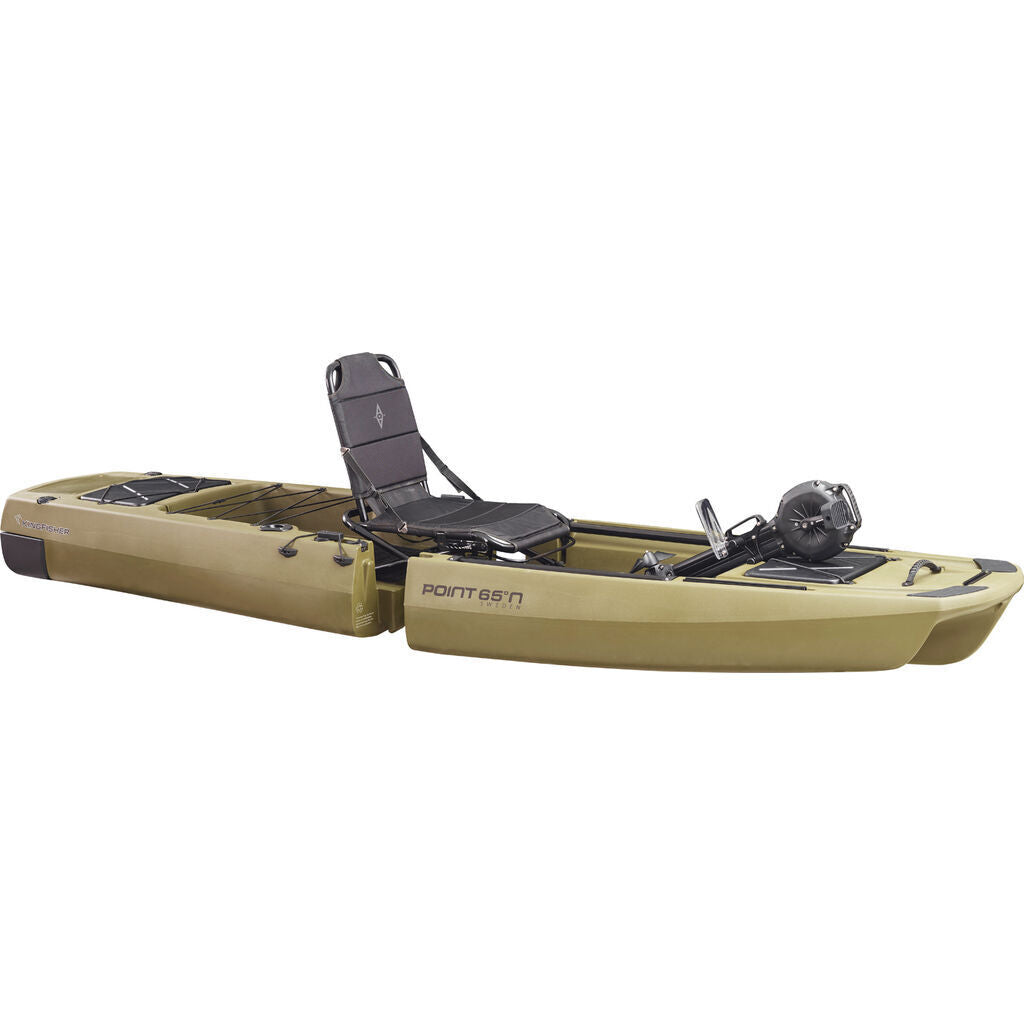 The Point 65 Kingfisher is the most stable fishing kayak ever. With its sleek 31.1" (79cm) beam, the King fisher is narrower than most fishing kayaks while maintaining excellent balance and stability. The hand-controlled, double-sided rudders make it exceptionally easy to maneuver and turn in tight conditions. The kayak can be powered by your arms, legs or an optional motor leaving your hands free to cast and catch your quota. The Kingfisher can be broken down into 2 pieces making it easy to transport from your car to your favorite fishing spot.