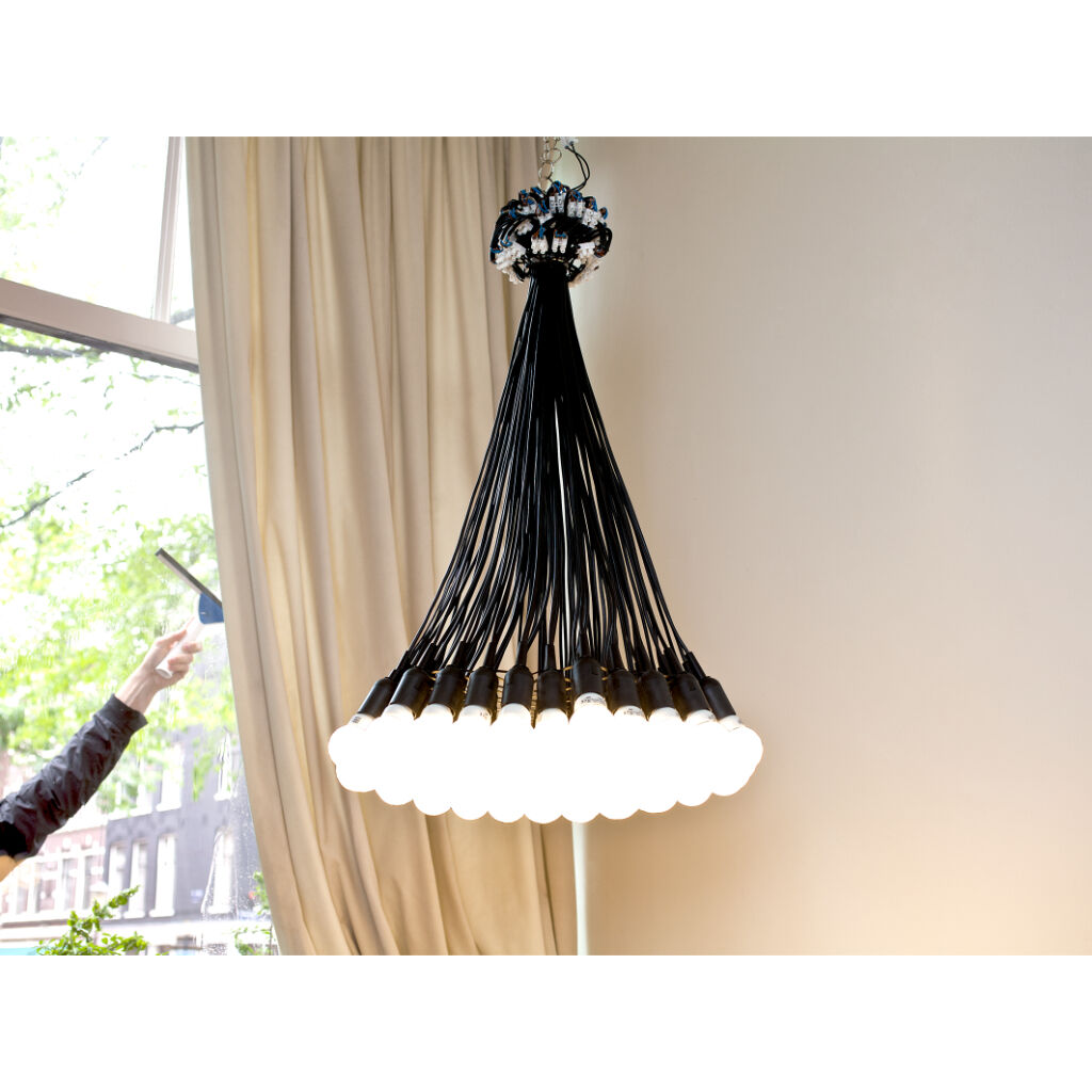 This lamp uses only what is necessary to create light: bulbs, wires, connectors. By multiplying these essential elements, an opulent chandelier is made. Less and more are united in a single product.