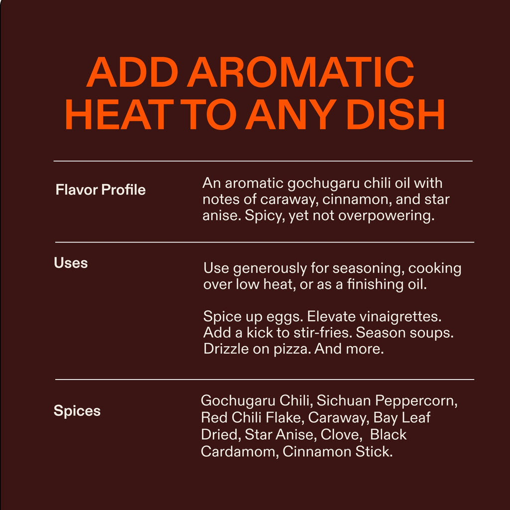 Meet your new chili obsession. Crafted with Chef Daniel Humm of Eleven Madison Park, this flavored oil infuses culinary algae oil with Korean Gochugaru chili and aromatic spices—rich in gut and heart friendly Omega-9, buttery-smooth, and perfectly balanced.