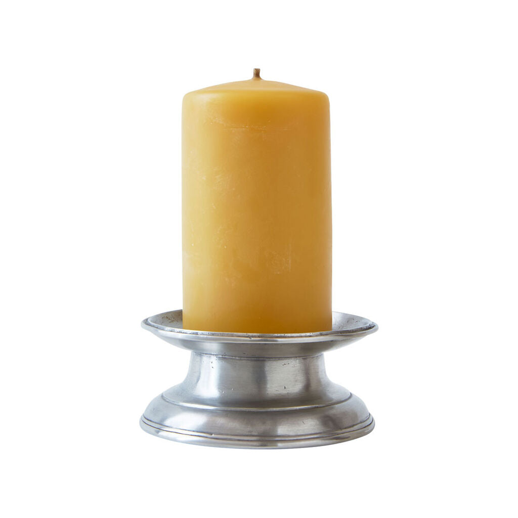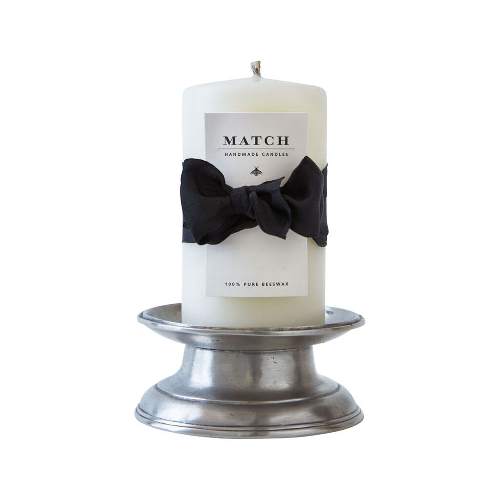 Handcrafted Italian pewter Made in Italy Dimensions: 4" H X 4.5" DIA Vintage, yet simple in design and style, the easy-to-use, pewter Match Taverna Pillar Base is an ideal accent on a table or countertop. Care: All match pewter can be hand washed in warm water with a liquid dish soap. Be sure to dry the pewter completely, as water allowed to dry on pewter may cause spots. Some items, such as Flatware and Dinnerware can be machine washed using a liquid dishwasher soap, on the lowest heat setting.