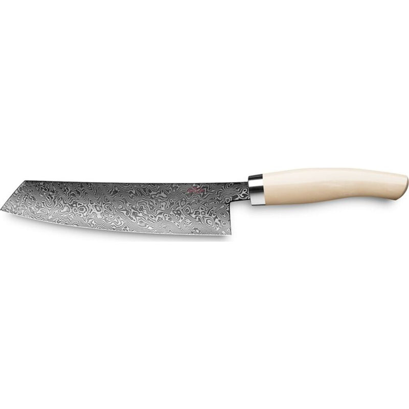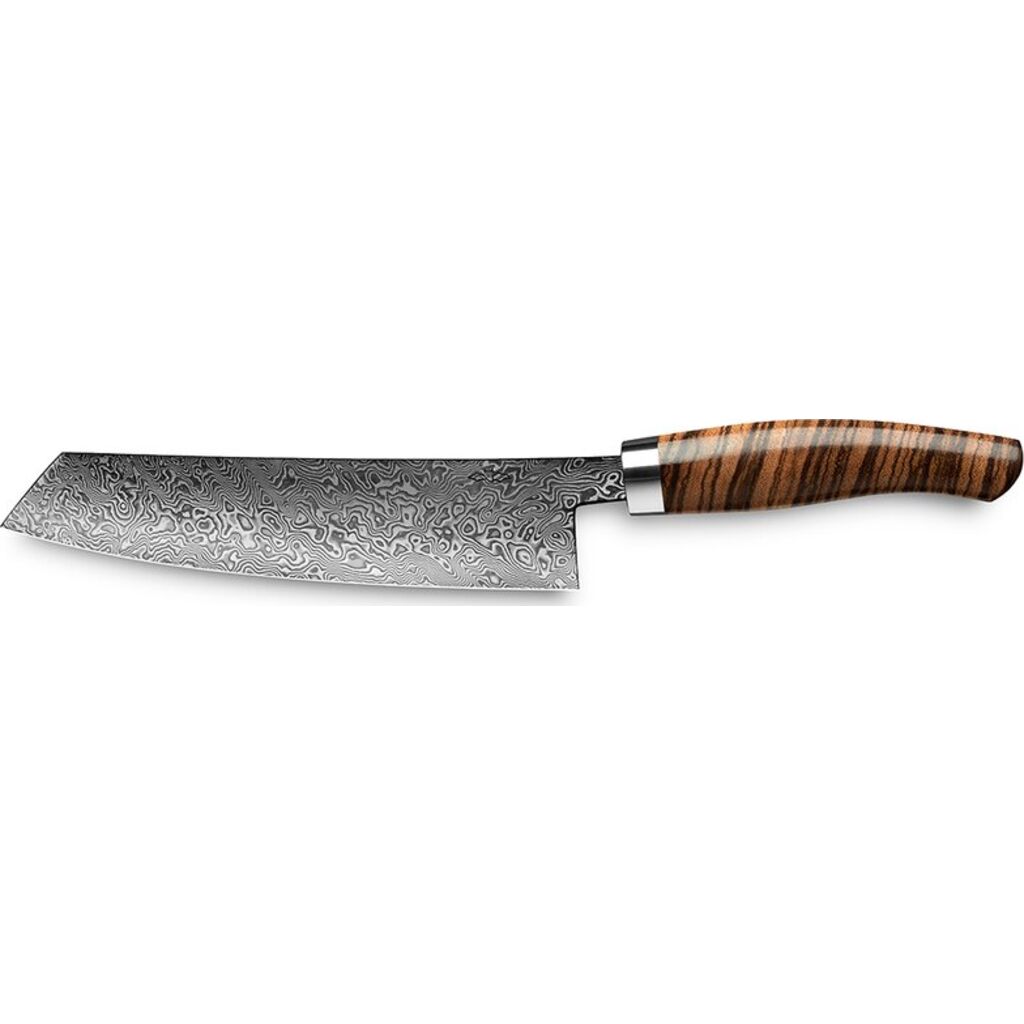 With the one sided grind, the hand forged damascus steel unleashes its full potential: From the combination of extremely fine carbon steel and an extremely thin blade originates an experience of sharpness that has no equal.