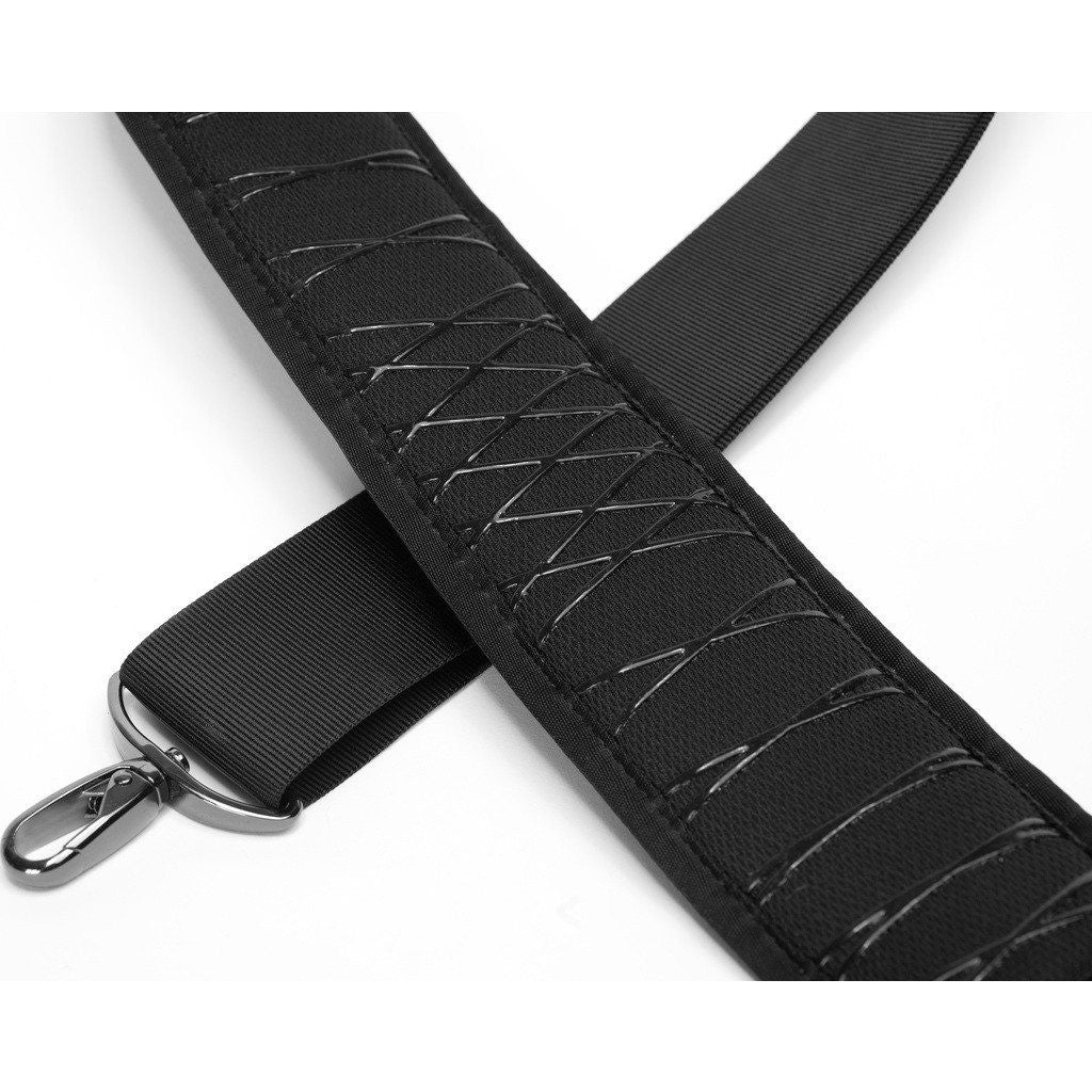 - Adjustable and removable nylon seatbelt shoulder strap with slip-resistant shoulder pad and custom light-weight aluminum buckles