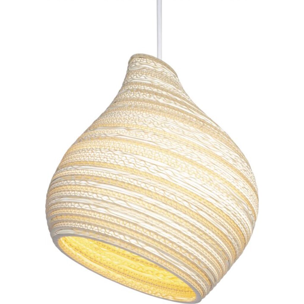 Scraplights are constructed from natural recycled cardboard precision cut by a laser. This gives the edges their classic dark appearance and enhances the warm light projected through the corrugation. The classic series includes many of the best-selling models such as the Moon and Disc, along with newer designs like the Hive and Nest The Hive and Nest pendants are the only members of the Scraplights collection that feature angled layers. A custom inner ring allows the cord set and bulb to hang straight.