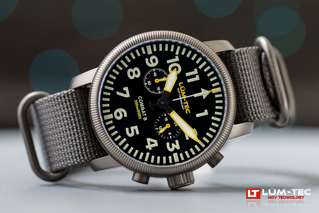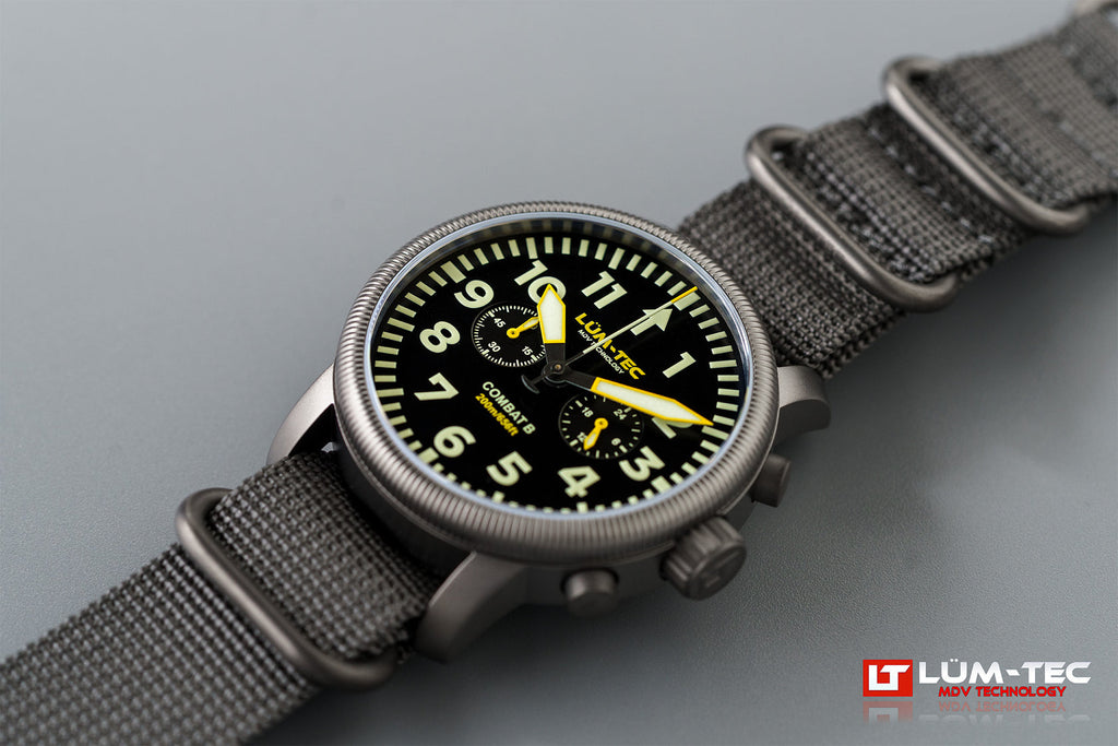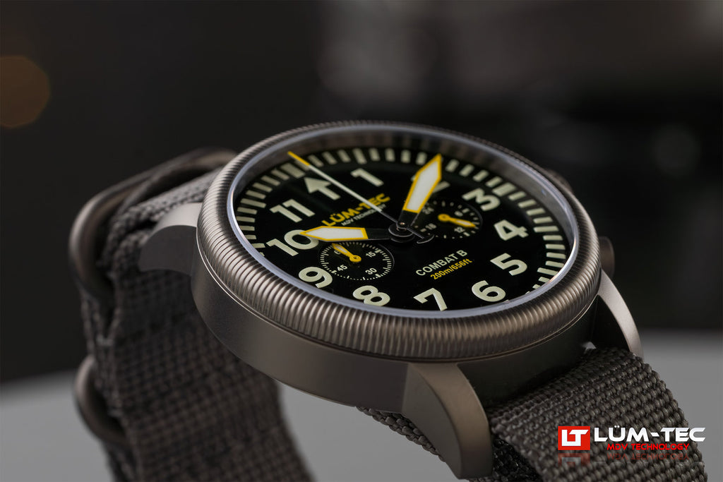 The LUM-TEC Combat B64 Chronograph is a bold and durable timepiece designed for extreme performance and everyday wear. Featuring a 43mm heat-treated 316L stainless steel case with a military-grade gunmetal PVD coating and bead-blasted finish, it offers rugged resilience and 200 meters of water resistance. The matte gray dial is complemented by diamond-cut hands and ultra-bright X1-grade Super-Luminova for exceptional visibility in all lighting conditions. Powered by the reliable Miyota OS21J chronograph movement, it includes a 60-minute timer, 24-hour subdial, and a 5-year battery life supported by anti-shock movement mounting. Limited to just 500 numbered pieces worldwide, the watch comes with both a leather and a heavy-duty nylon strap, making it as versatile as it is tough. Hand-assembled and tested in Ohio, the Combat B64 blends American craftsmanship with military-inspired performance.