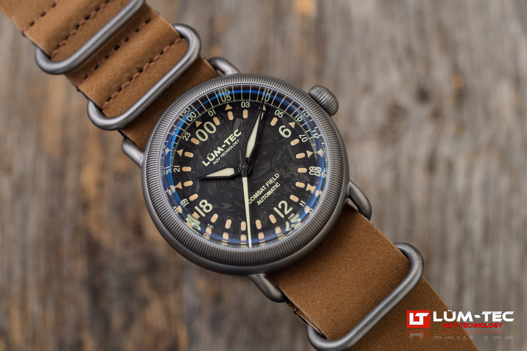 The LÜM-TEC Combat Field X5 24H is a mission-ready timepiece engineered for professionals who demand precision and durability. Featuring a lightweight yet rugged 44mm forged titanium case with a bead-blasted gunmetal PVD finish, it houses a regulated Miyota 9075 automatic movement with true GMT functionality—allowing independent hour-hand adjustment for seamless time zone shifts. The carbon-fiber dial showcases a full 24-hour layout and is equipped with multi-layered MDV® luminous markers and hands for exceptional legibility in low-light environments. A double-domed sapphire crystal with military-grade anti-reflective coating ensures clarity and protection, while the screw-down crown, threaded sapphire caseback, and Viton® gaskets provide 100 meters of water resistance. Each watch comes with both a charcoal-gray nylon strap and a brown leather military strap, both featuring matching gunmetal hardware.