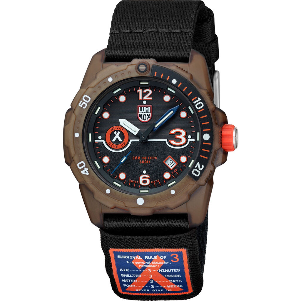 This watch represents the very important ‘Survival Rule of 3’ that outdoor adventurers must adhere to. These rules show the priorities in which one will have to secure in order to live through extreme conditions. The rules are also printed on a removable sleeve and attached onto the strap as a reminder. Bear lives and operates by these priorities of survival and the rule of three is a clear guide for him during times of high stress. Simple rules, simple things are the easiest to remember during those tough times. The watch is designed in striking blue and orange with an emphasis on ‘3’ with an enlarged numeral in Super-Luminova glow.